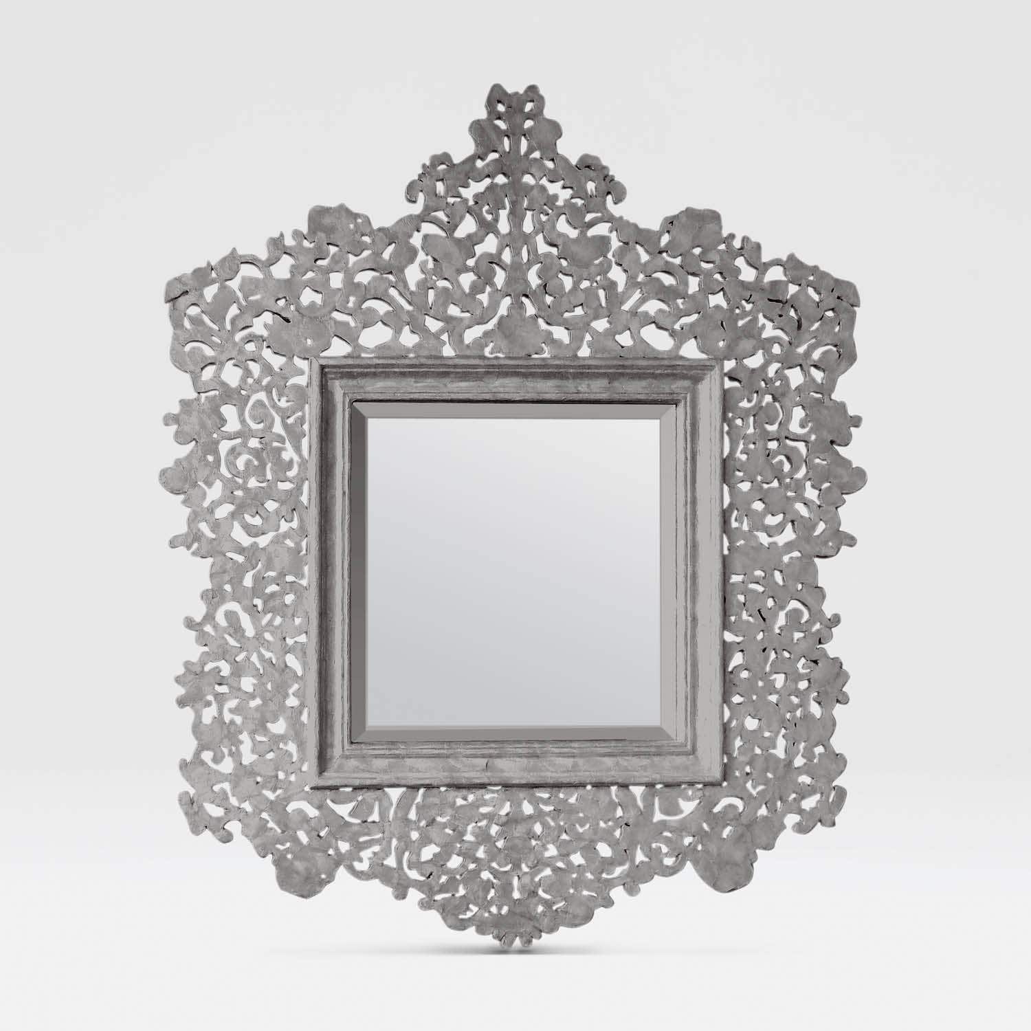 An inner frame surrounds this square mirror. Delicate floral latticework is covered by hand in a mosaic of capiz shell. The entire piece is then antiqued by hand.