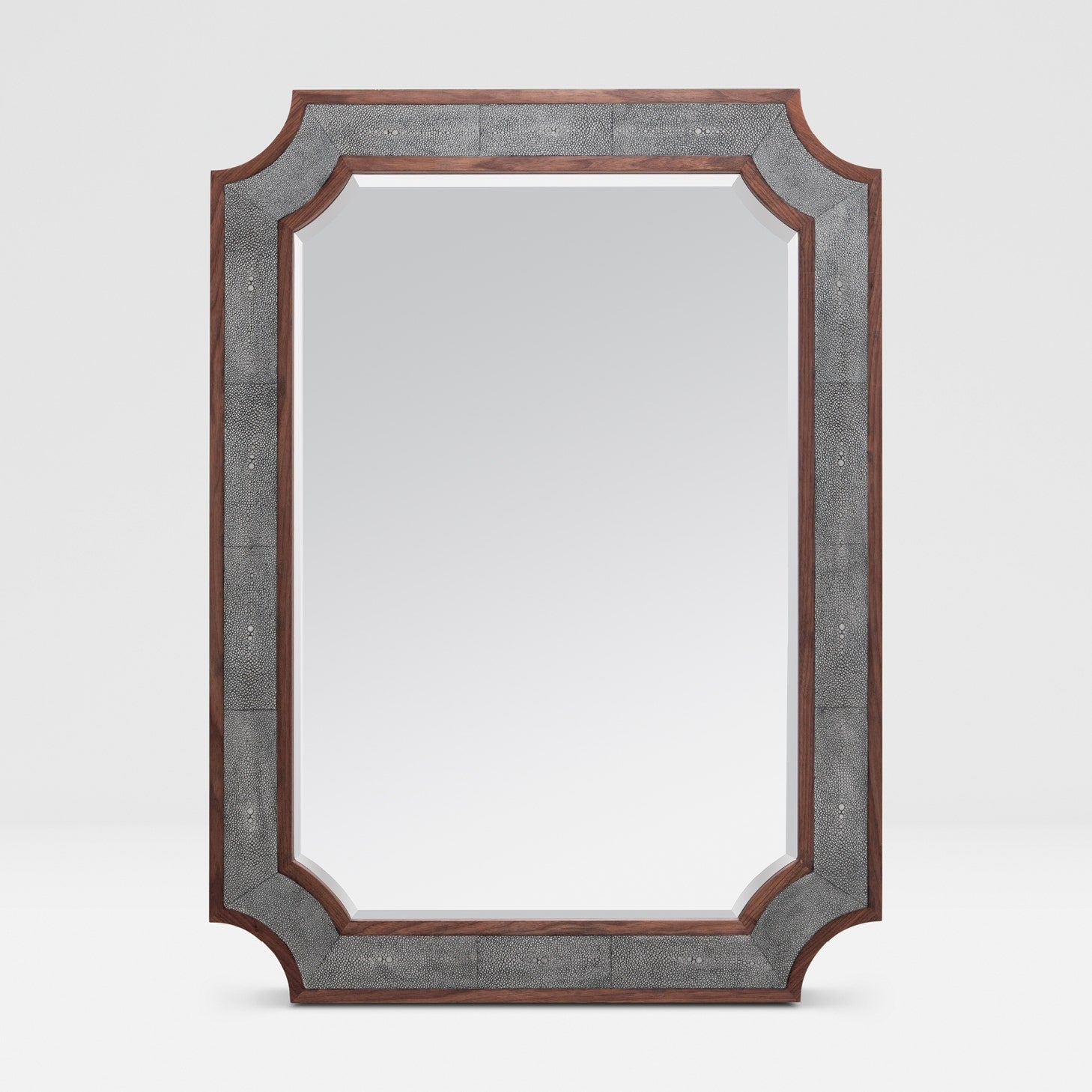 Starting with a clipped-corner rectangle shape of our Vincent mirror, we made the James using our detailed faux shagreen. Each piece has small, half-inch wood inner and outer bands, which frame beautiful faux shagreen panels.