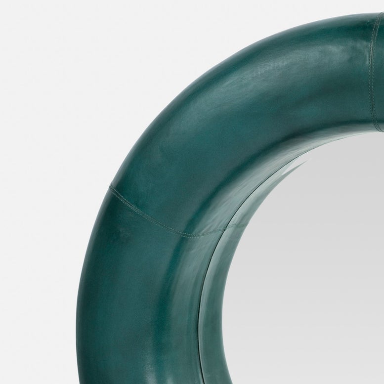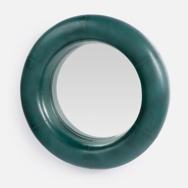 Give a room a robust profile and strong presence with our Merin porthole mirror. Full-grain leather is especially luxurious in dramatic Dark Teal. This mirror has a rounded raised frame with an approximate 6'' depth. Natural variations in this material may occur. Slight differences in color and texture are characteristics of this collection's aged full-grain leather. This durable, high quality leather may show inherent markings, distressed appearance, and variations in pattern.