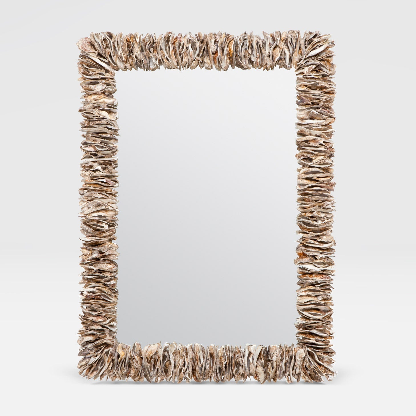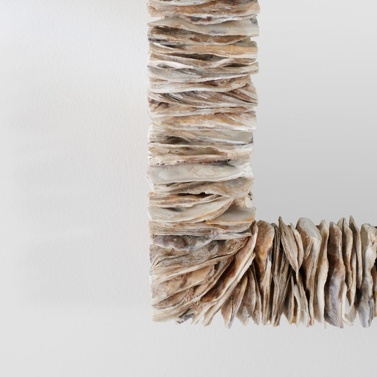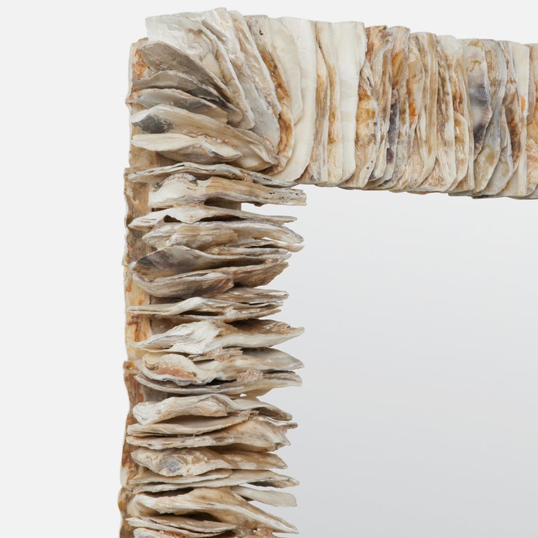 The textural Mina is a perfect example of how Made Goods does beachy-rather than a sparse use of oyster shells, the frame of this coastal-inspired mirror stacks them up, highlighting their unique shape and hues. The raw materials create an almost sculptural feel, an inspired and modern take on the typical shell piece. The thick oyster shell frame has an approximate 3" or 4" depth.