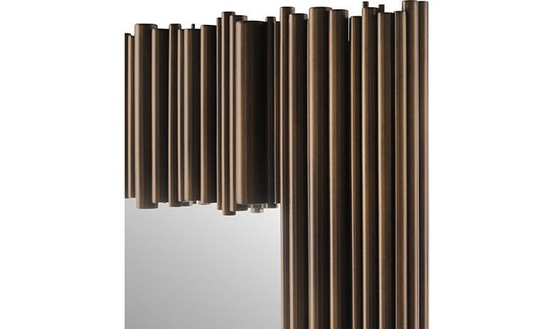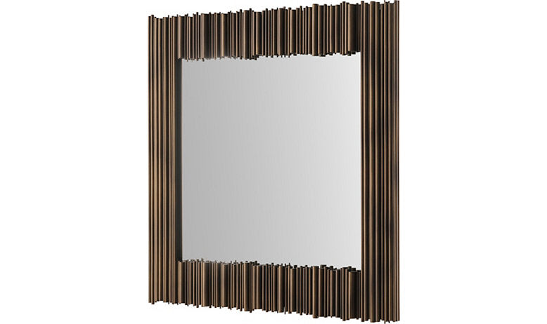 The elegant and large-scale Lahar Square Mirror has the versatility to grace a living room, entryway or beyond. Cascading and linear, it is framed by an uninterrupted doweled pattern that evokes the blend of earth and water that flows down volcanoes.