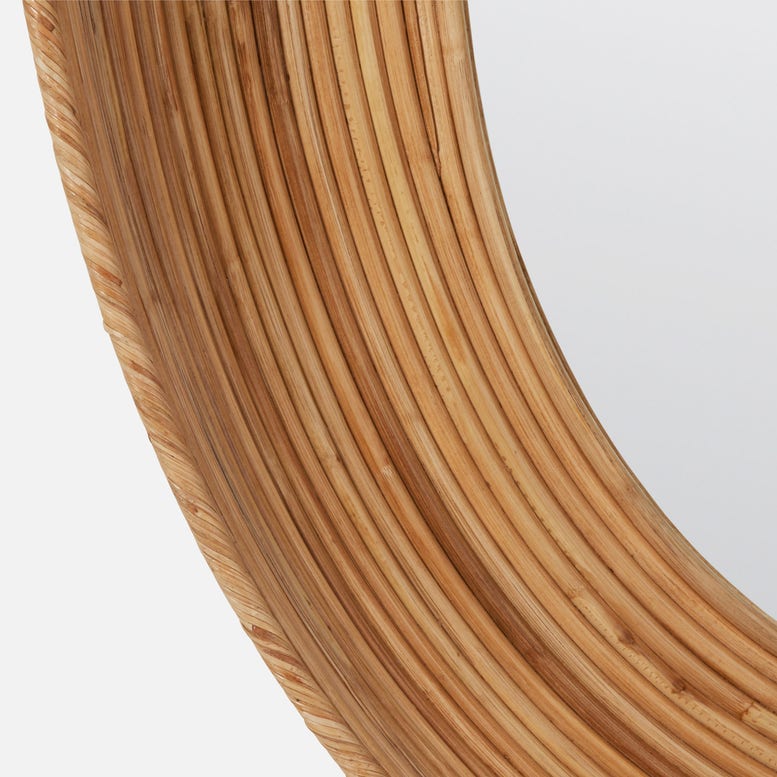 Our Rosalie oval mirror's subtle intricacy is built through rattan poles of increasing size, bound together by an invisible adhesive and coated in a clear resin that makes it shine.