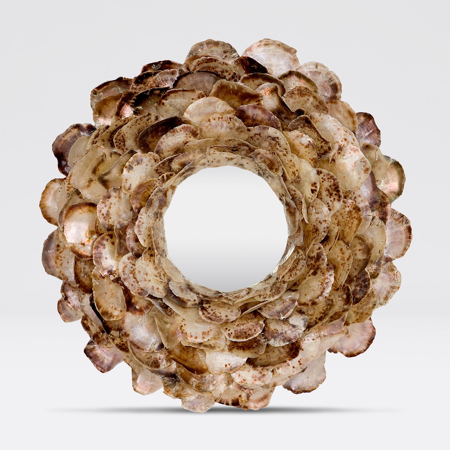Shells are arranged as petals of a 45-inch round flower. The Venus starts with small shells at the mirror's edge that get larger, up to 12 inches, as they radiate out from the mirror's center. The Venus is feminine, organic, modern, and dramatic. The layers of organic shells give the mirror an approximate 6" depth.