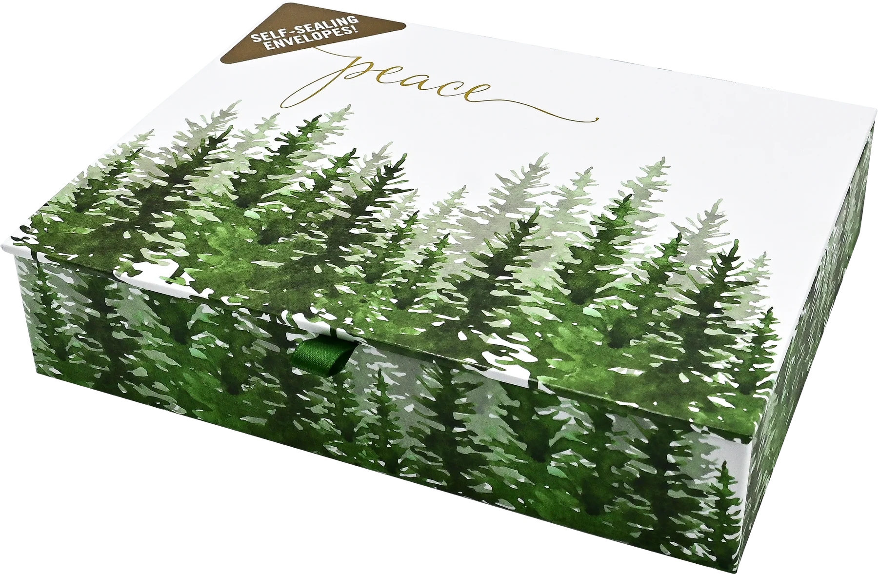 Serene greeting cards depict an evergreen forest beneath the word ''Peace.''