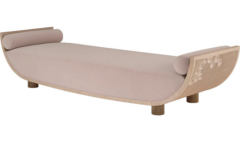 Tight seat open chaise with quartered oak veneer and square mesh cane ends featuring oak blossom detail and textured brass feet. (2) 6" x 29.75" Bolster Pillows standard.