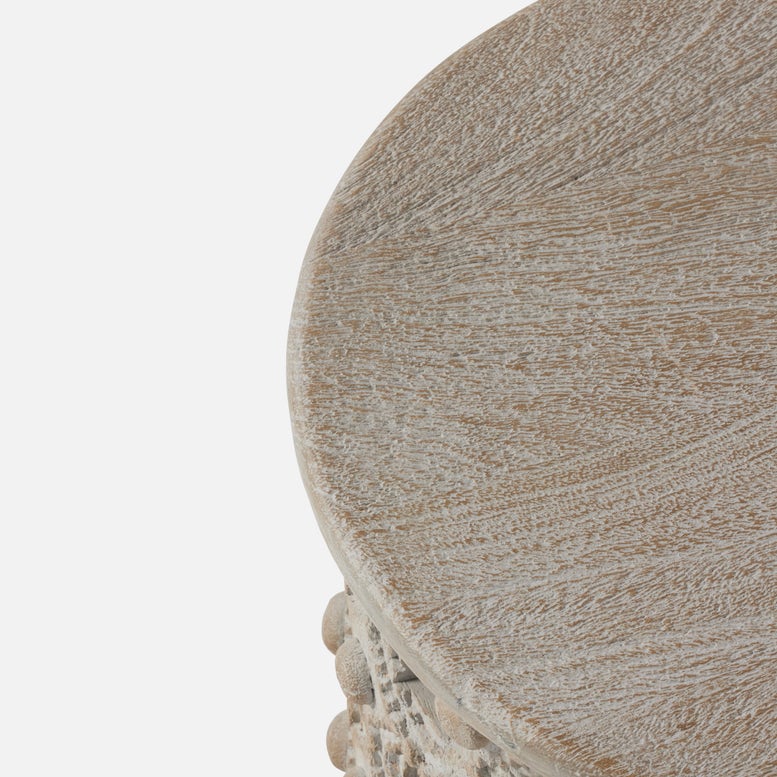 Our round Orson stool features open latticework on the sides and a solid surface. The intricately carved mango wood is available in a light gray and dark rustic finish .