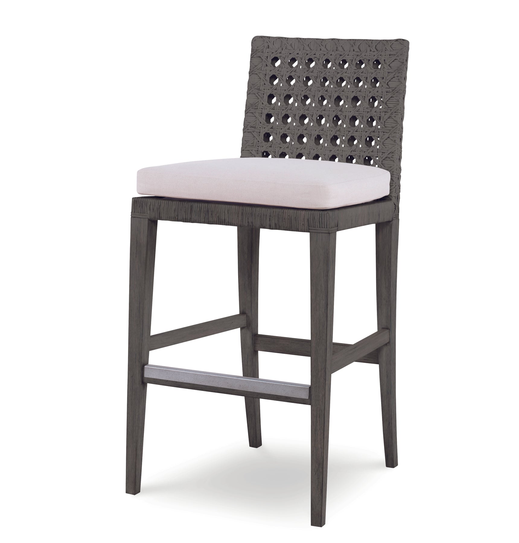 Our Litchfield bar stool is a classic silhouette, with pretty tapered legs and a simple square back and arms. Exceptional here as it is rendered in beautiful mahogany solids with open, woven peel caning all hand applied in a intricate pattern to form the back details. An upholstered seat in linen like flax colored fabric.