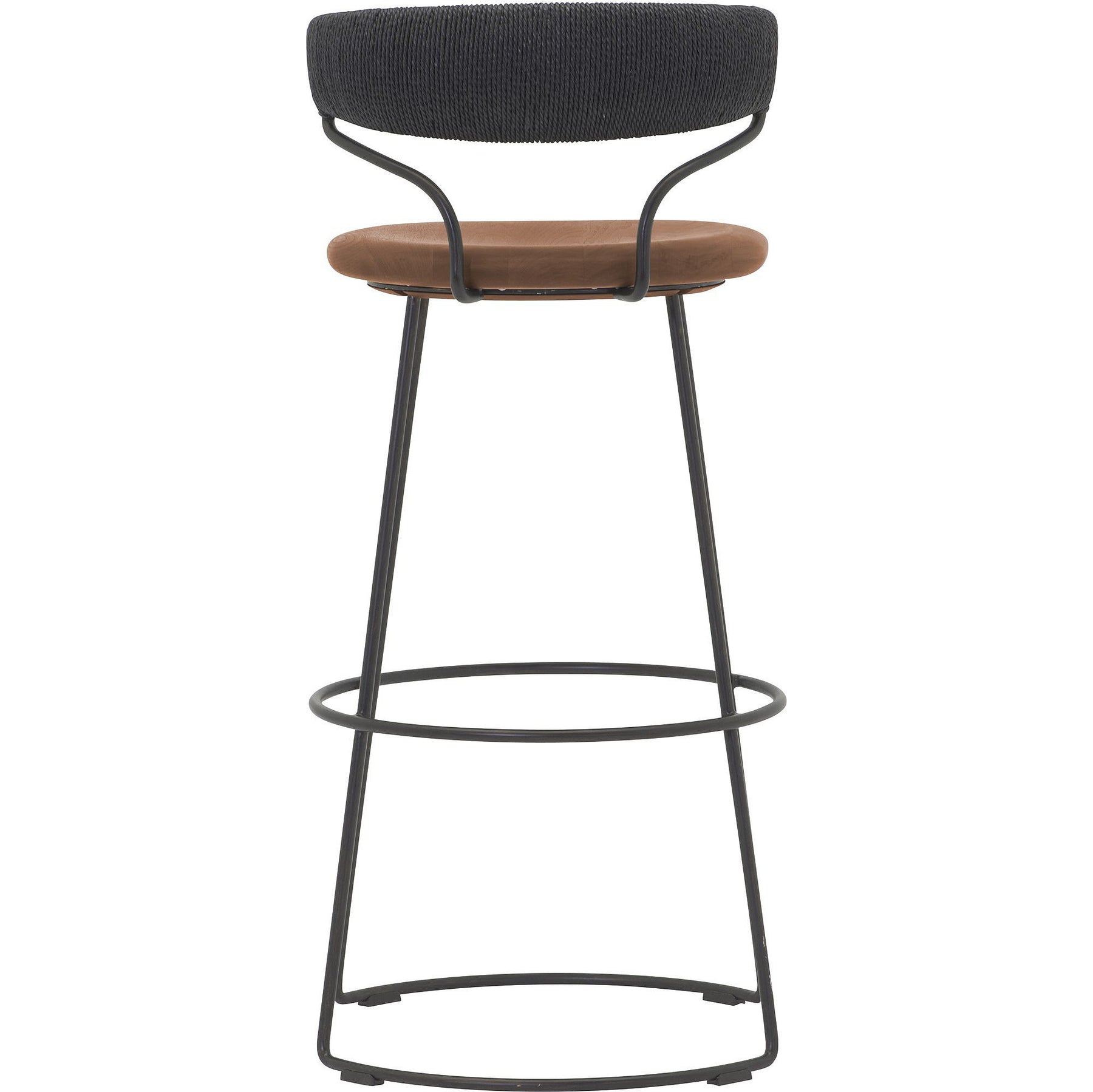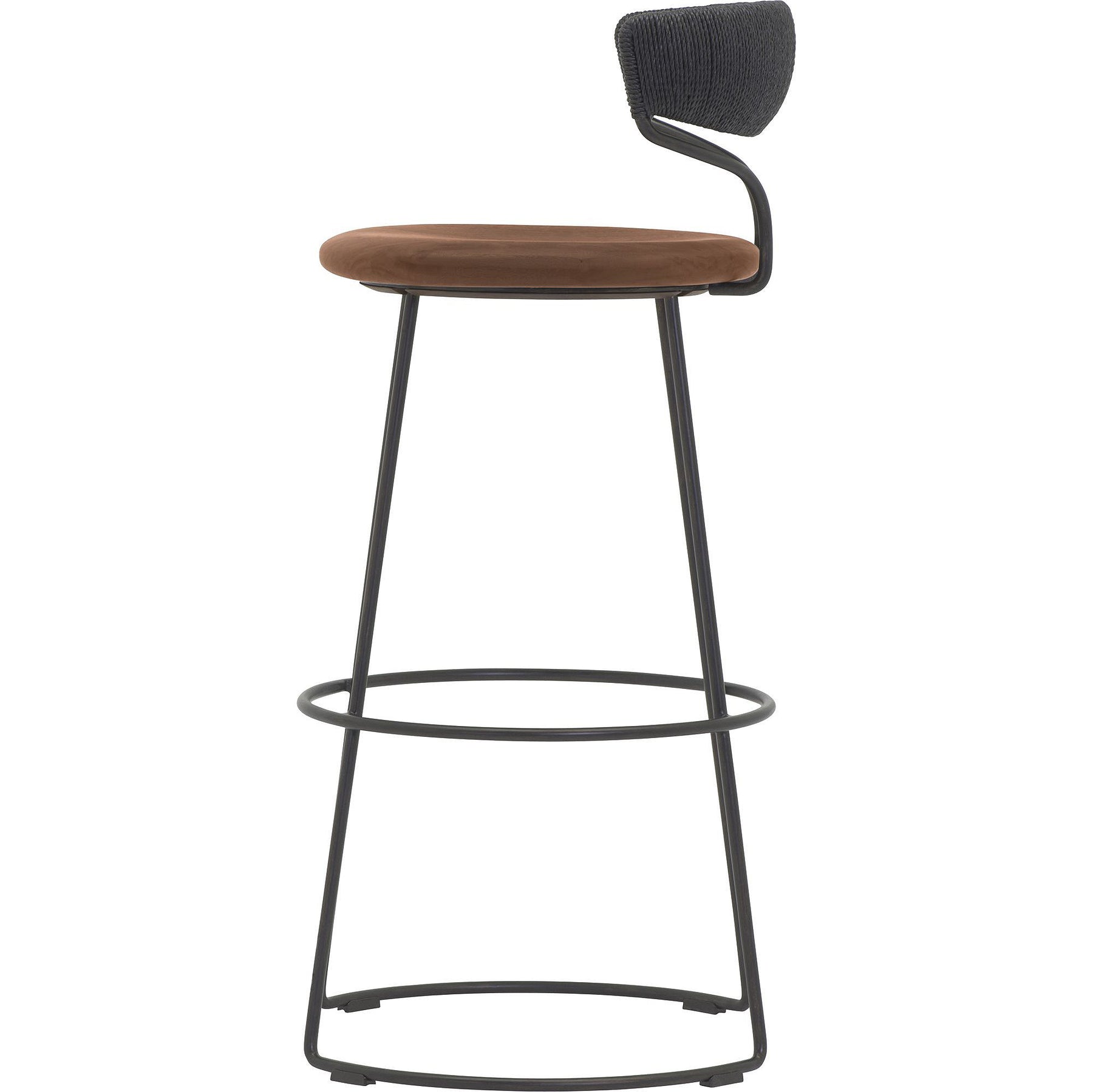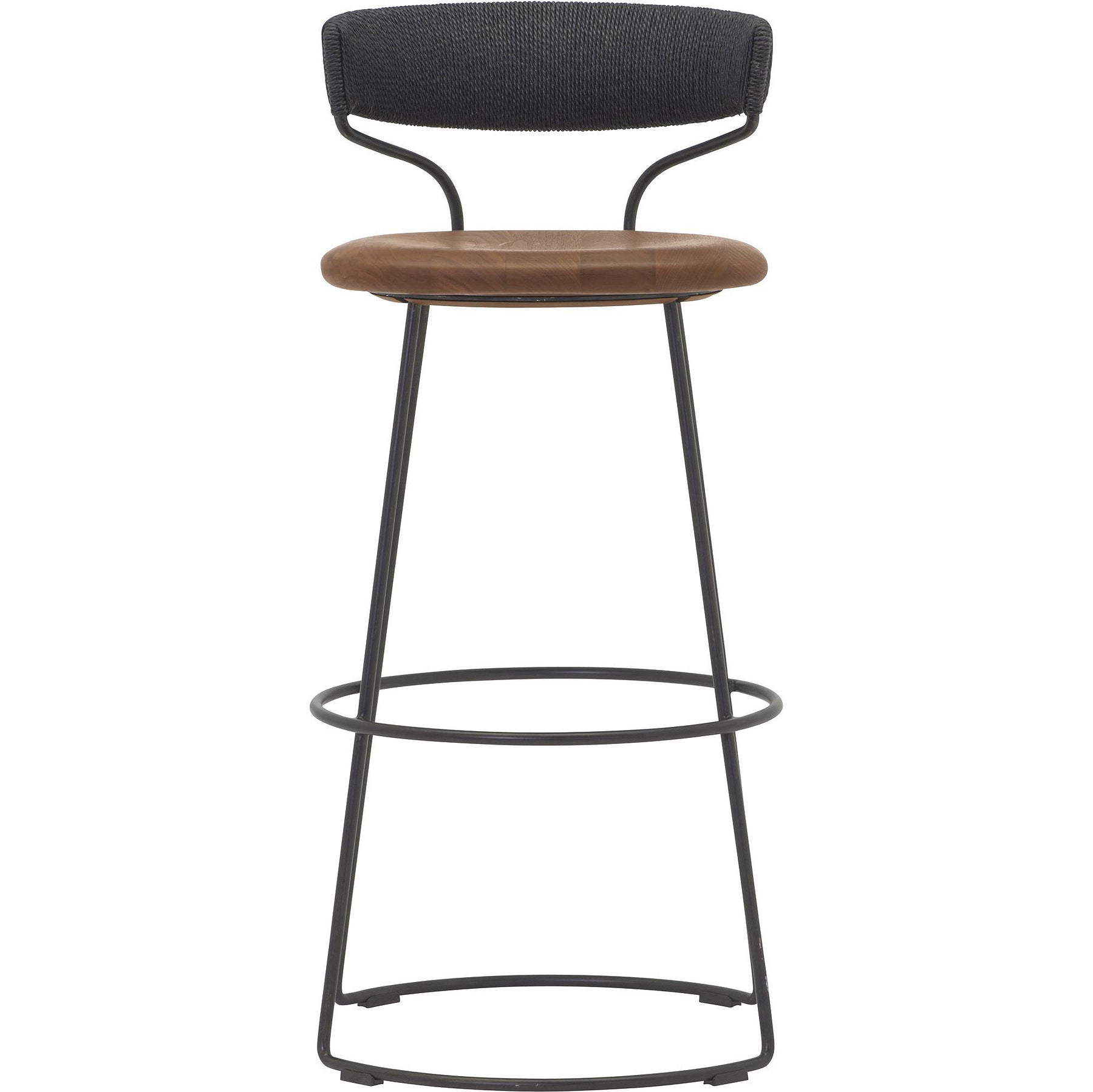 The Danish Cord Swivel Bar & Counter Stool is contemporary in form and distinctive in design. It is marked by a refined balance of materials with a curved satin walnut seat, hand-woven Danish cord back rest and a solid steel base. A circular footrest mirrors the curved base. Available in a blackened steel base with black Danish cord.