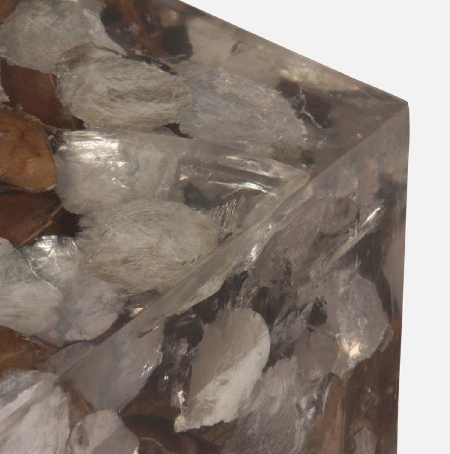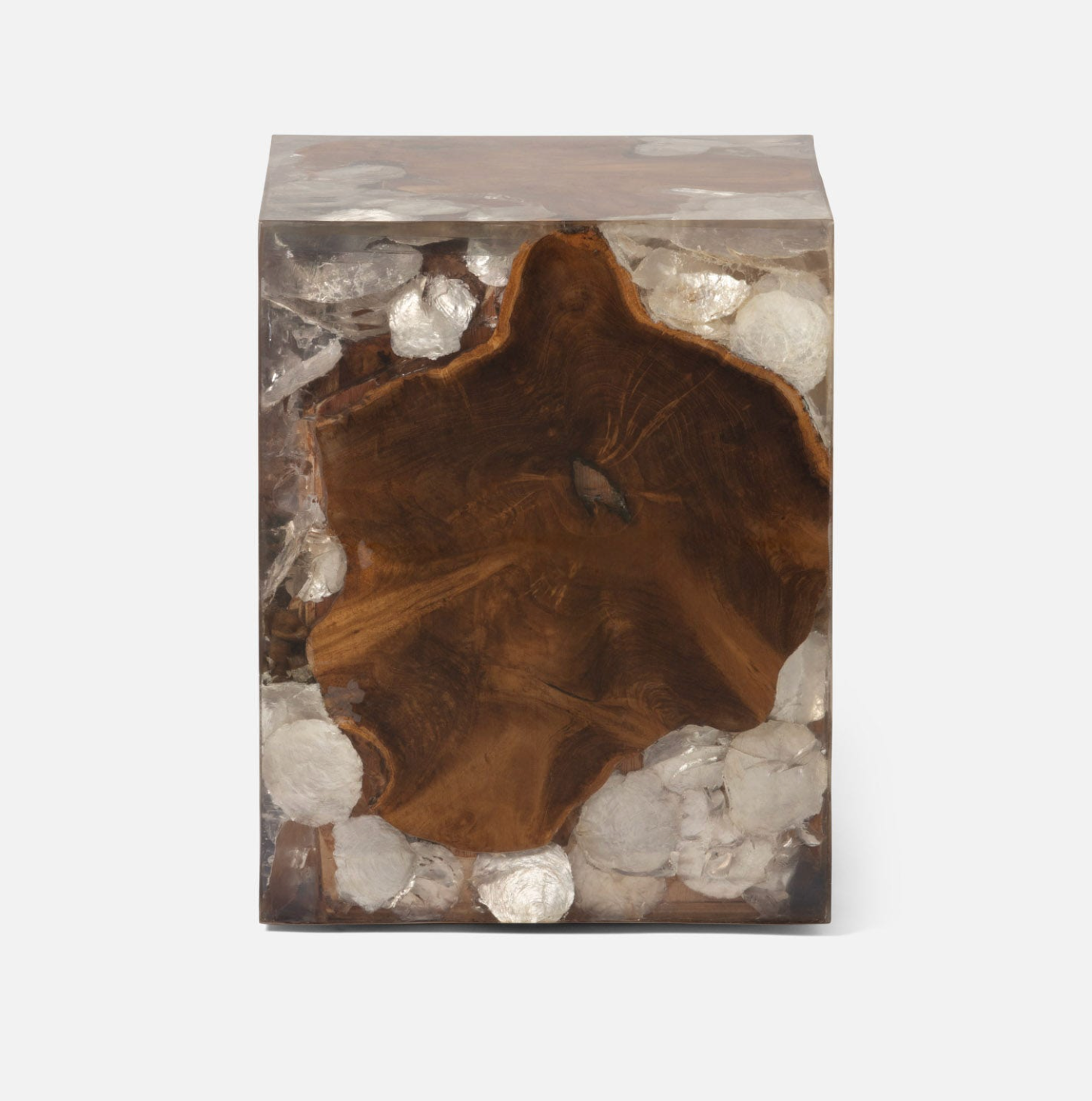 The dichotomy of teak wood with rivers of iridescent shell-like resin results in a luxe look inspired by nature.