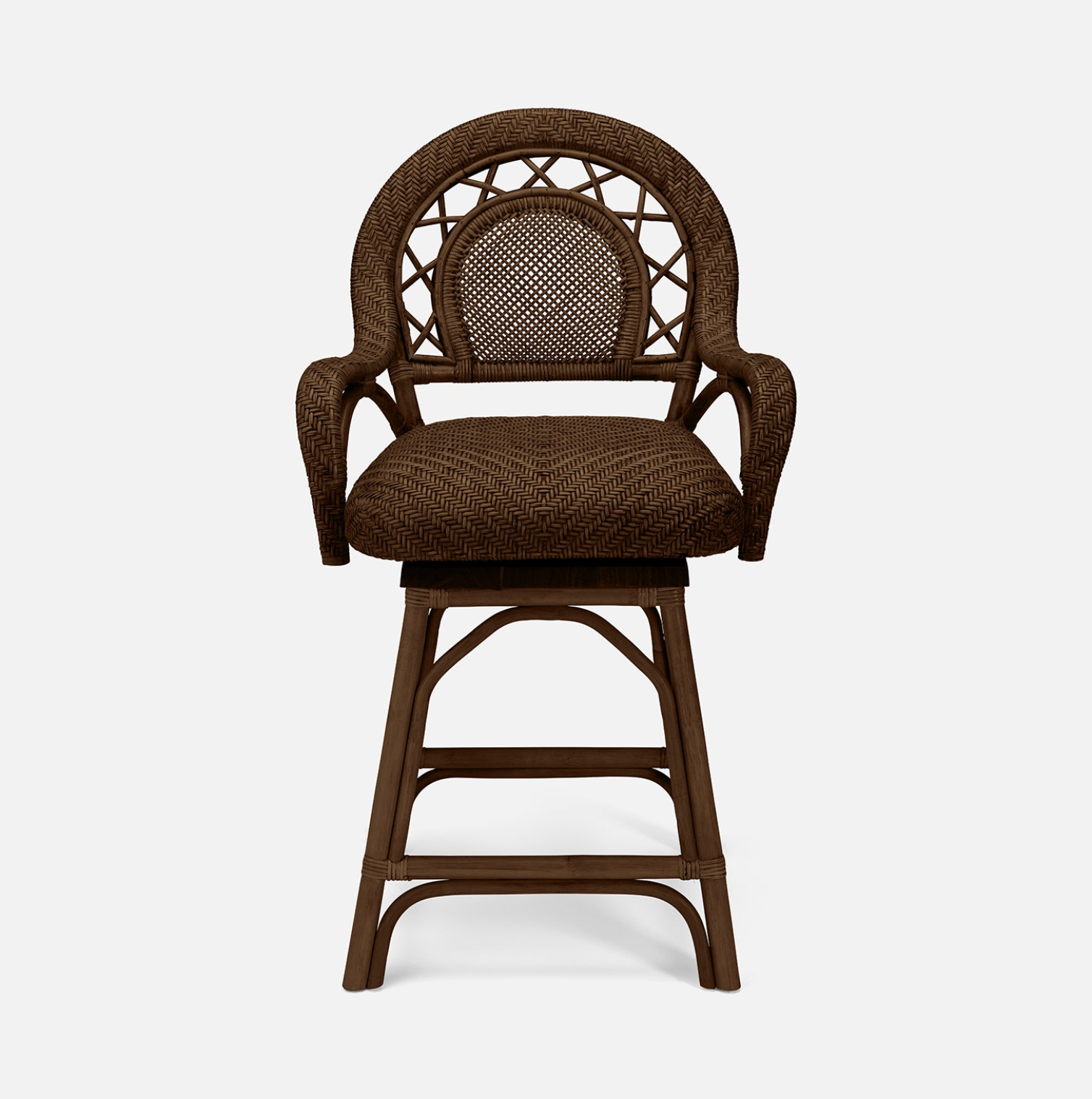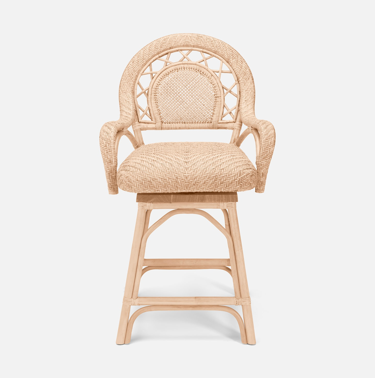 The Katalina swivel counter stool is a charming vintage addition to an eclectic home. Handwoven with natural peeled rattan, intricate details cover the padded seat, back support, and legs.