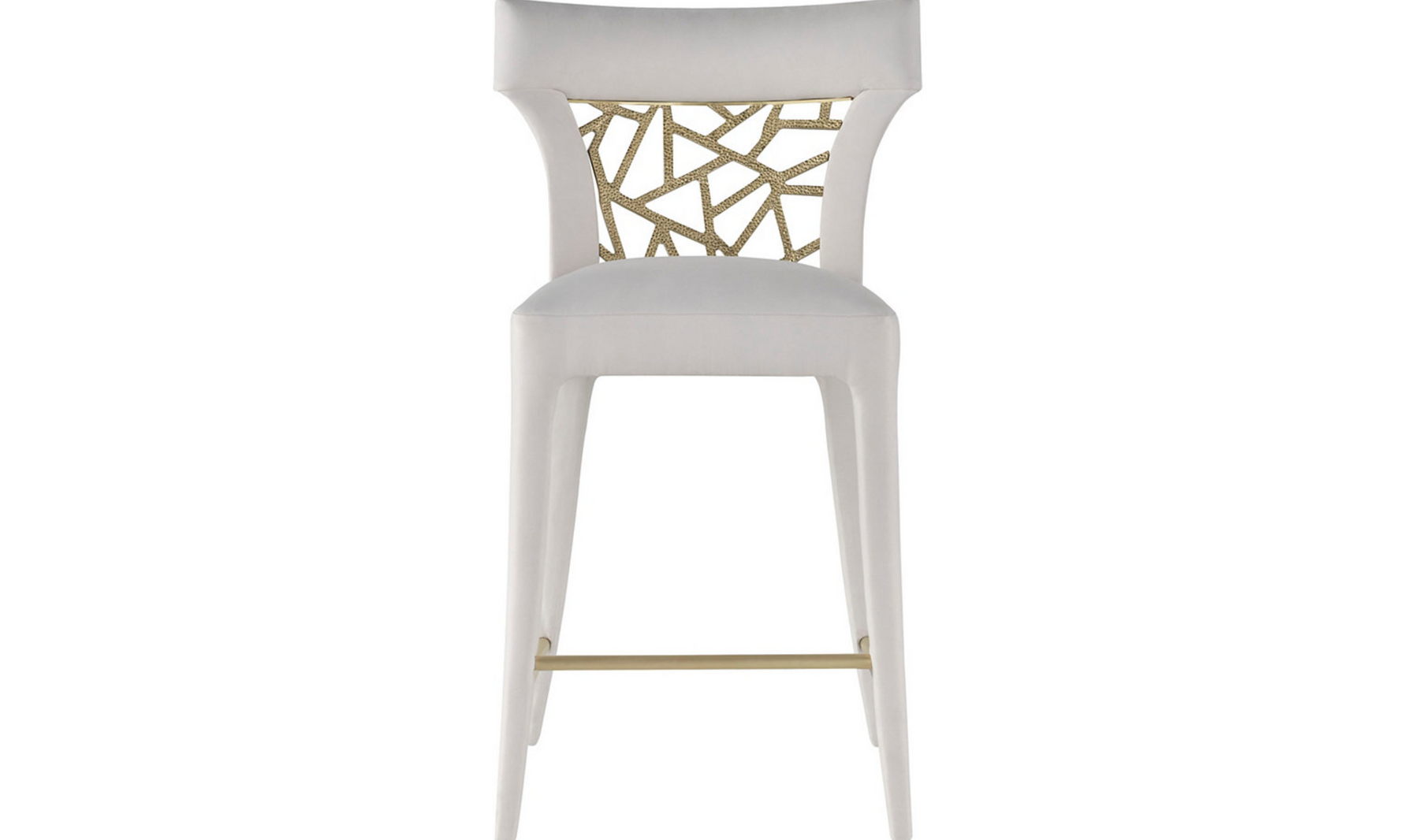 Inspired by a bronze threaded lace-back cocktail dress, the Filigree Counter Stool displays an ornately patterned back plate made in Liquid Bronze.