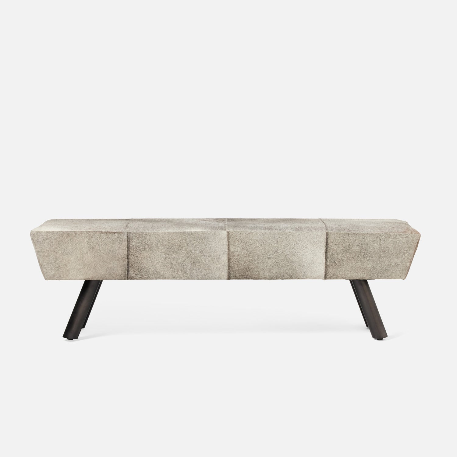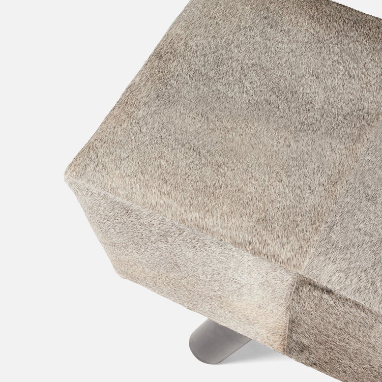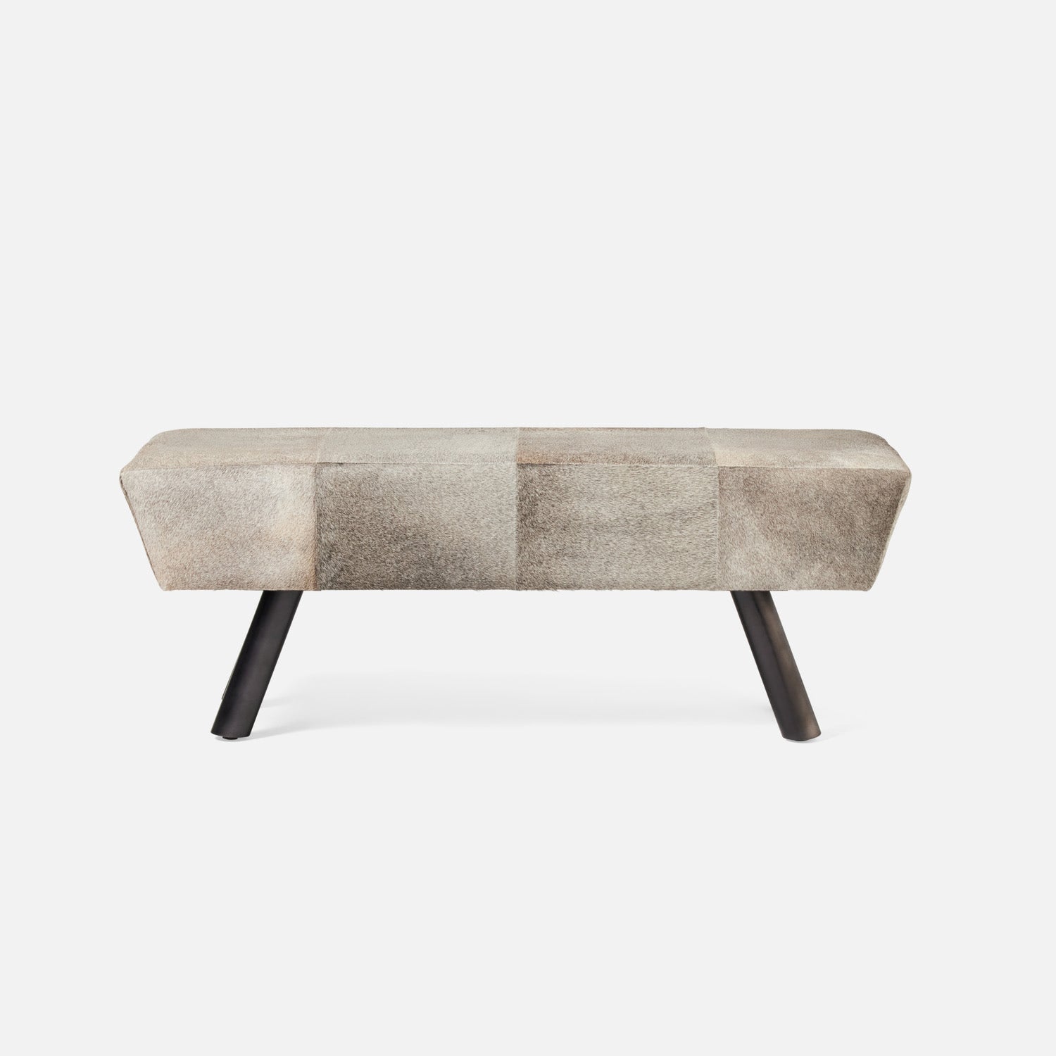 In a pommel horse style, our Trent bench is elevated in a patchwork of warm light gray hair-on-hide. The minimal cylindrical legs are crafted from steel in a bronze finish.