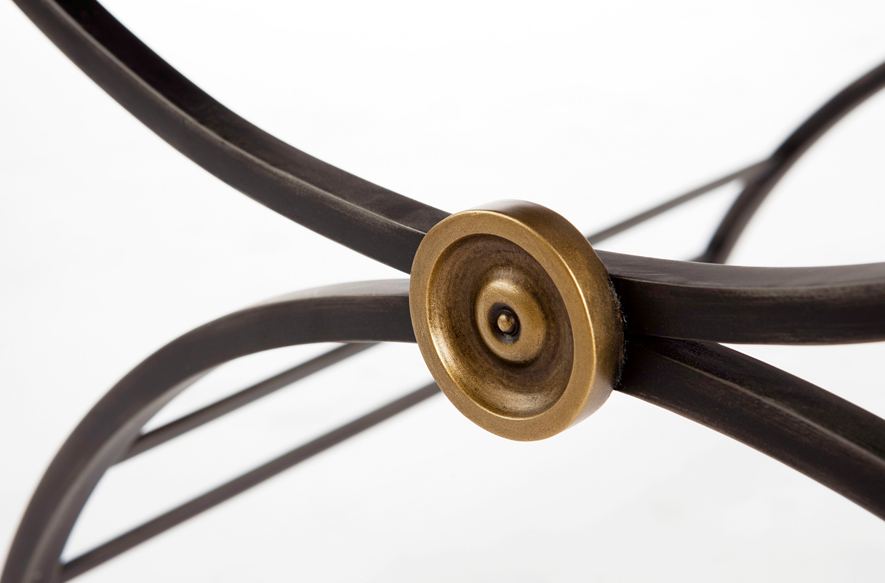 The Niles Bench can be paired at the foot of a bed, in front of a sofa or warm fireplace. It also can work as an ottoman in front of your favorite chair. The base is constructed of a x-based square tubed metal frame that is centered with a brass rosette. The top is upholstered in natural textured linen.