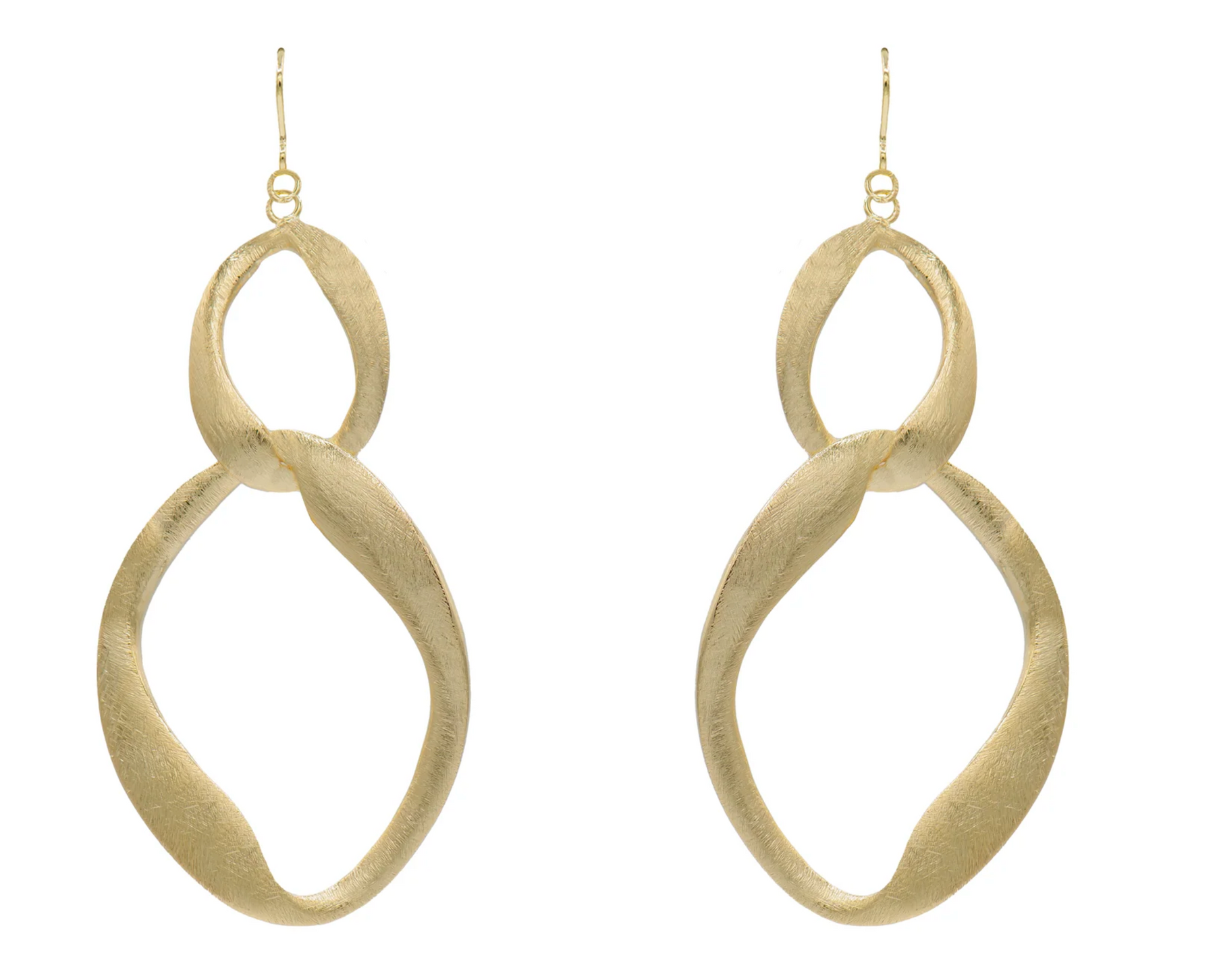 These elegant 18k gold-plated dangle earrings feature interlaced geometric shapes, creating a modern and sophisticated design. Handmade in Brazil, they showcase expert craftsmanship and attention to detail.