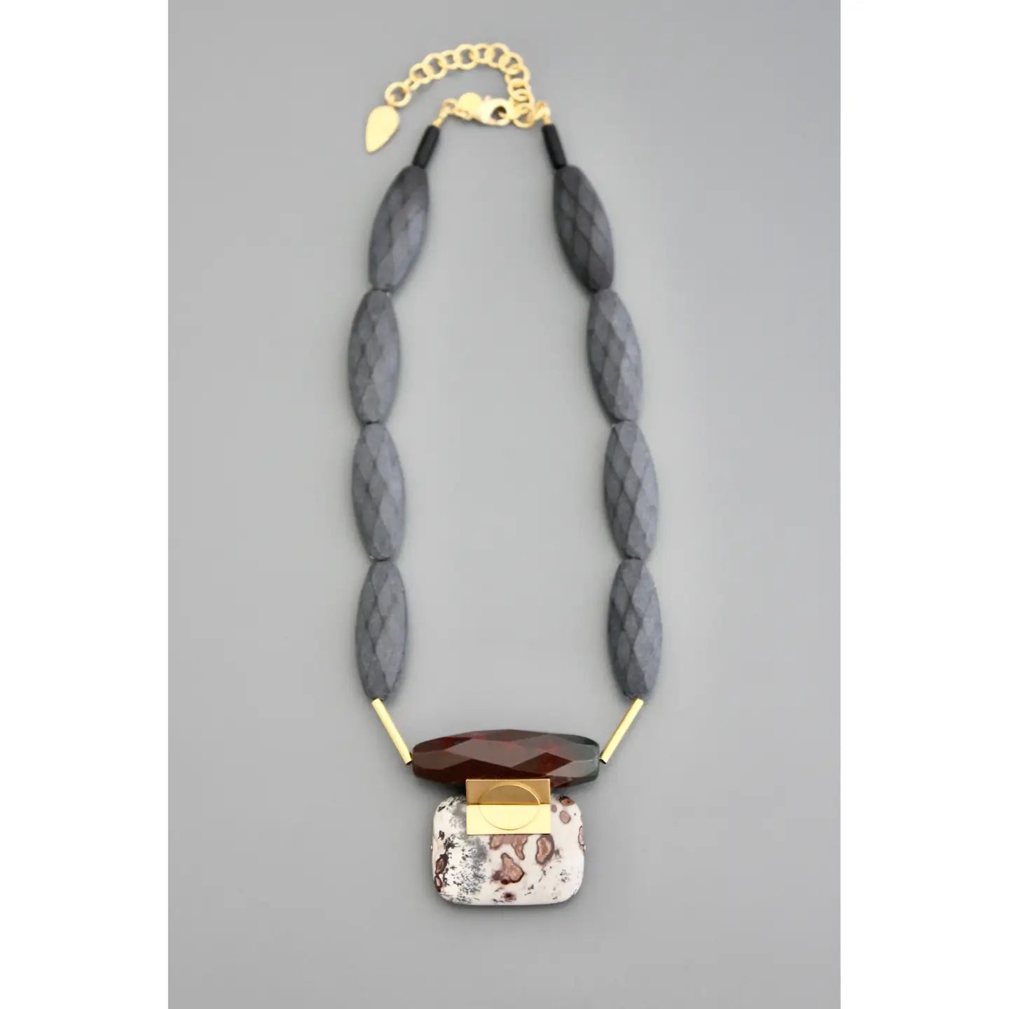 The Geometric Jasper and Acrylic Necklace with faceted matte acrylic and jasper pendant.