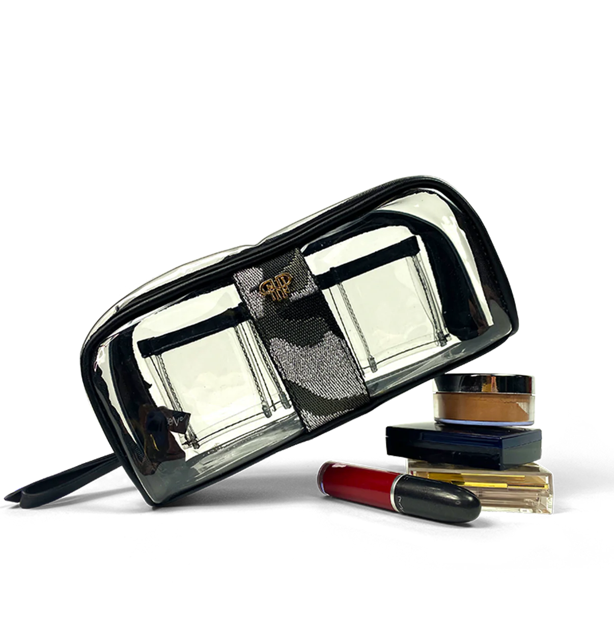 No more wondering if you’ve forgotten your favorite lipstick at home... thanks to the Makeup Case. Now, you will be able to see all of your favorite essentials! This clutch features 3 interior pockets and a clear view design, with a beautiful metallic Silver Camo ribbon detail.