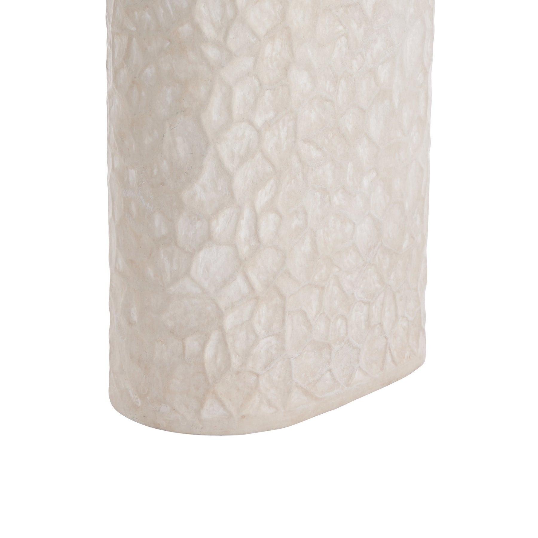 With its carved and weathered finish, our terracotta lamp feels like an ancient found object. Monolithic in shape and glazed in eggshell, it is accented with antique brass-plated steel hardware. An off-white linen shade lined in off-white cotton mimics its oval form. Matching finial. Finish will vary.