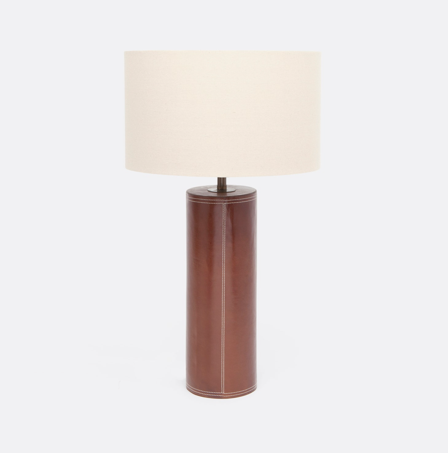 The simple stately lamp, perfect for a study or library, boasts leather contrast stitching. Natural variations in this material may occur. Slight differences in color and texture are characteristics of this collection's aged full-grain leather. This durable, high quality leather may show inherent markings, distressed appearance, and variations in pattern.