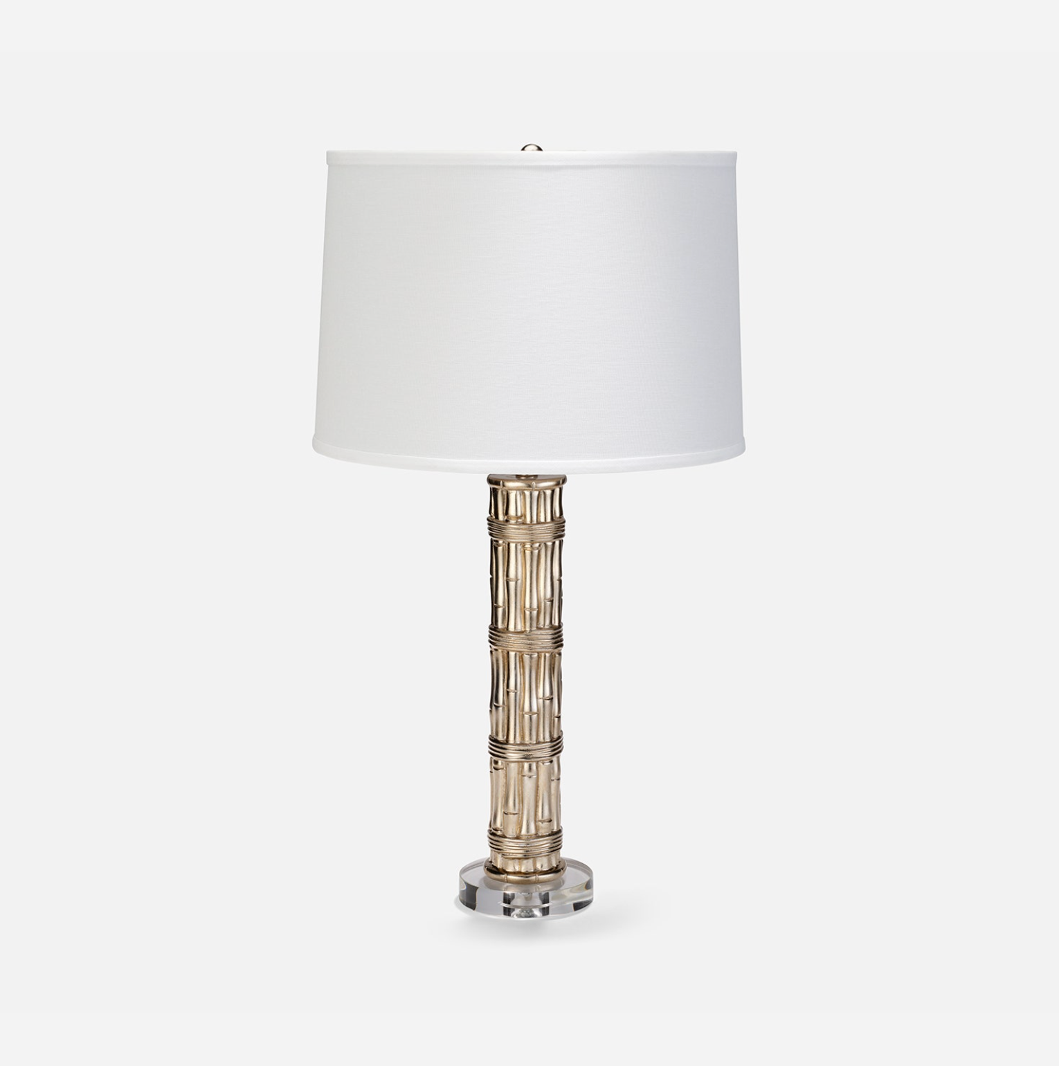 The nature-inspired Kent table lamp stands tall on a slim round base. Artfully constructed from resin into a bamboo design, the cylindrical shape adds textural interest to a thoroughly modern piece.