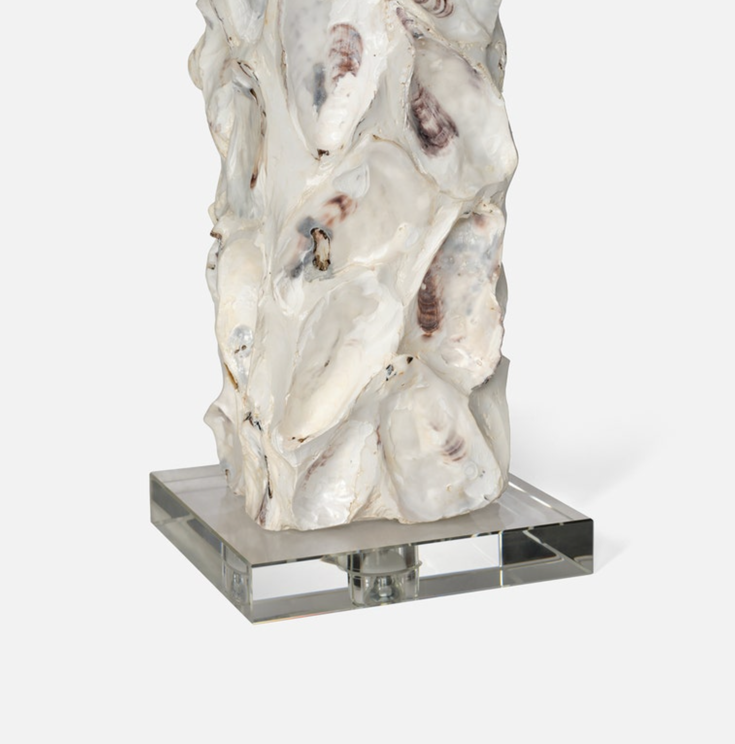 Oyster shells, one of our most popular materials, are stacked in a plaster resin to create the sculptural shape of the Raina's rectangular column. The textural lamp is set atop an acrylic base, pairing its pretty, natural look with a contemporary foundation.