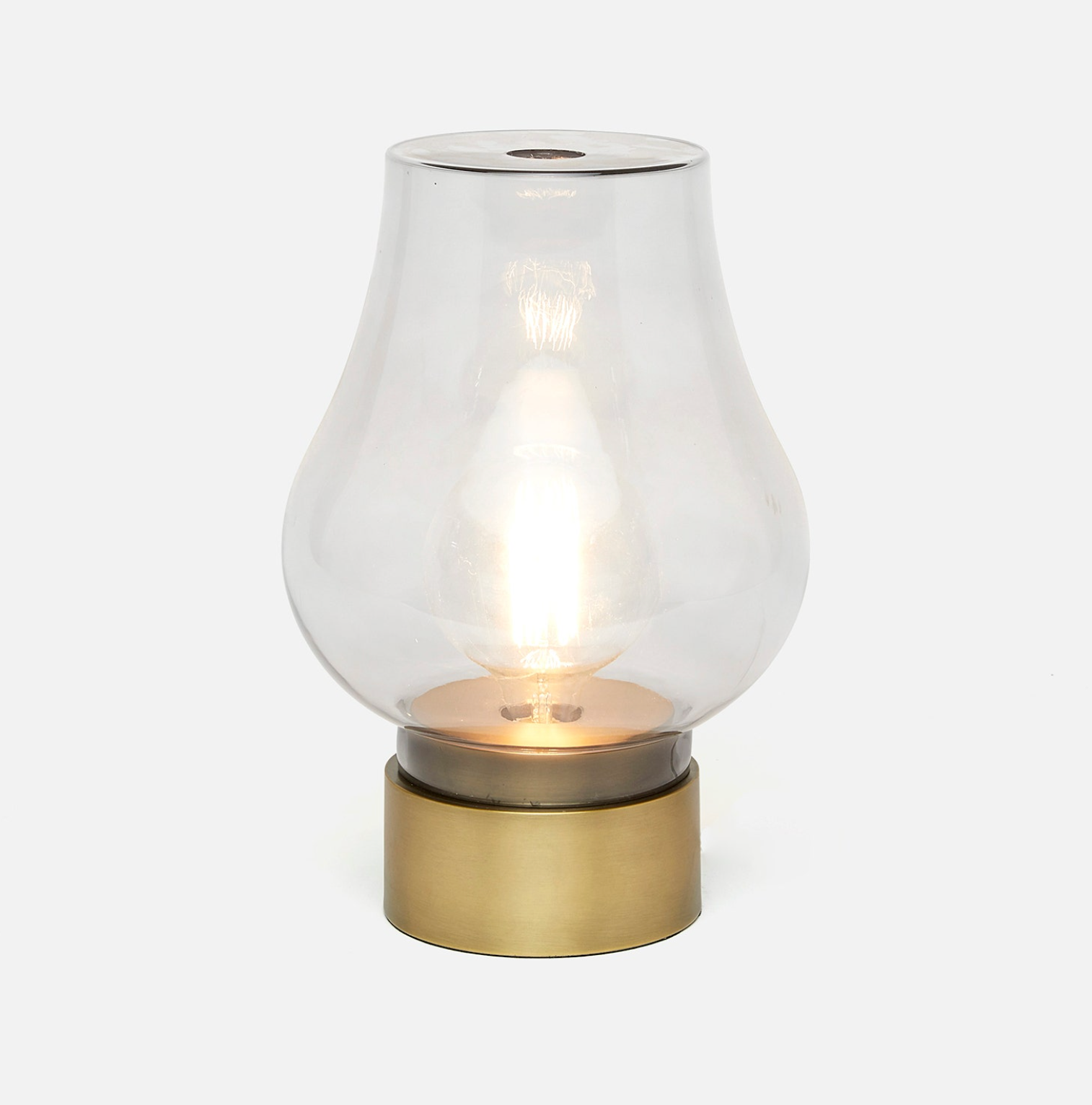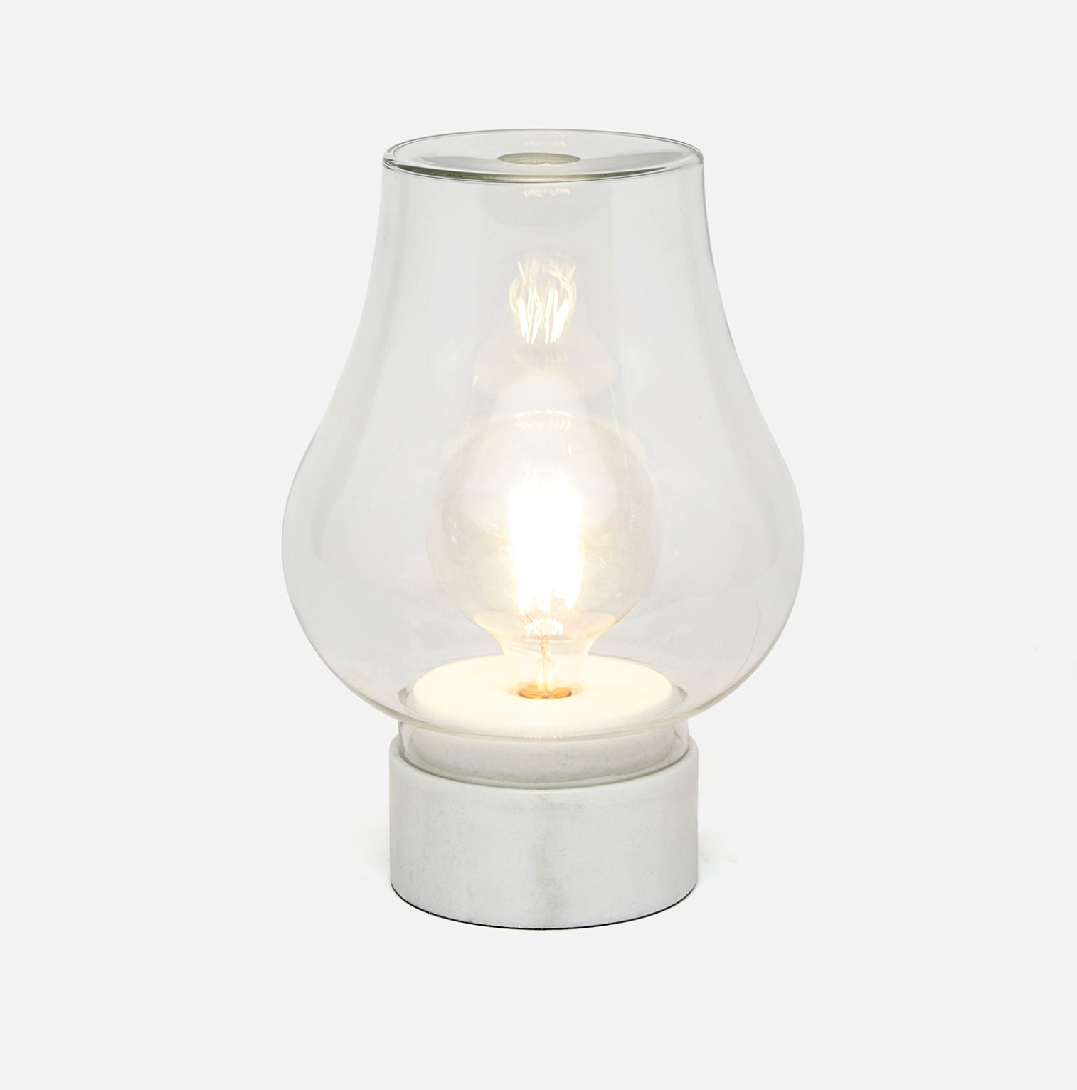 An oversized bookcase lamp with well-designed depth, our Reco features a classic bulb shape and circular base. Clear glass complements Crystal White marble, while smoky glass is paired with Black marble or Antiqued Brass.
