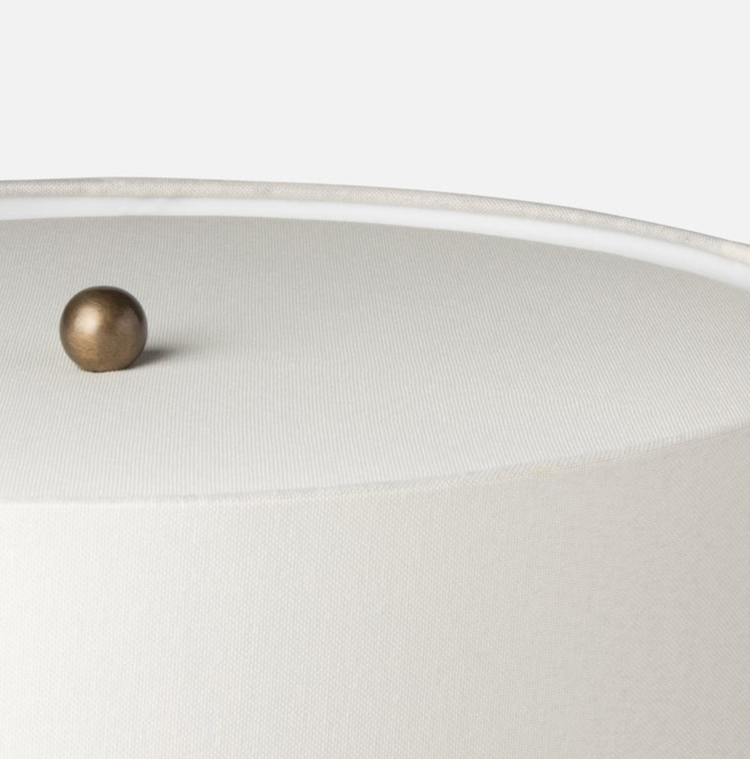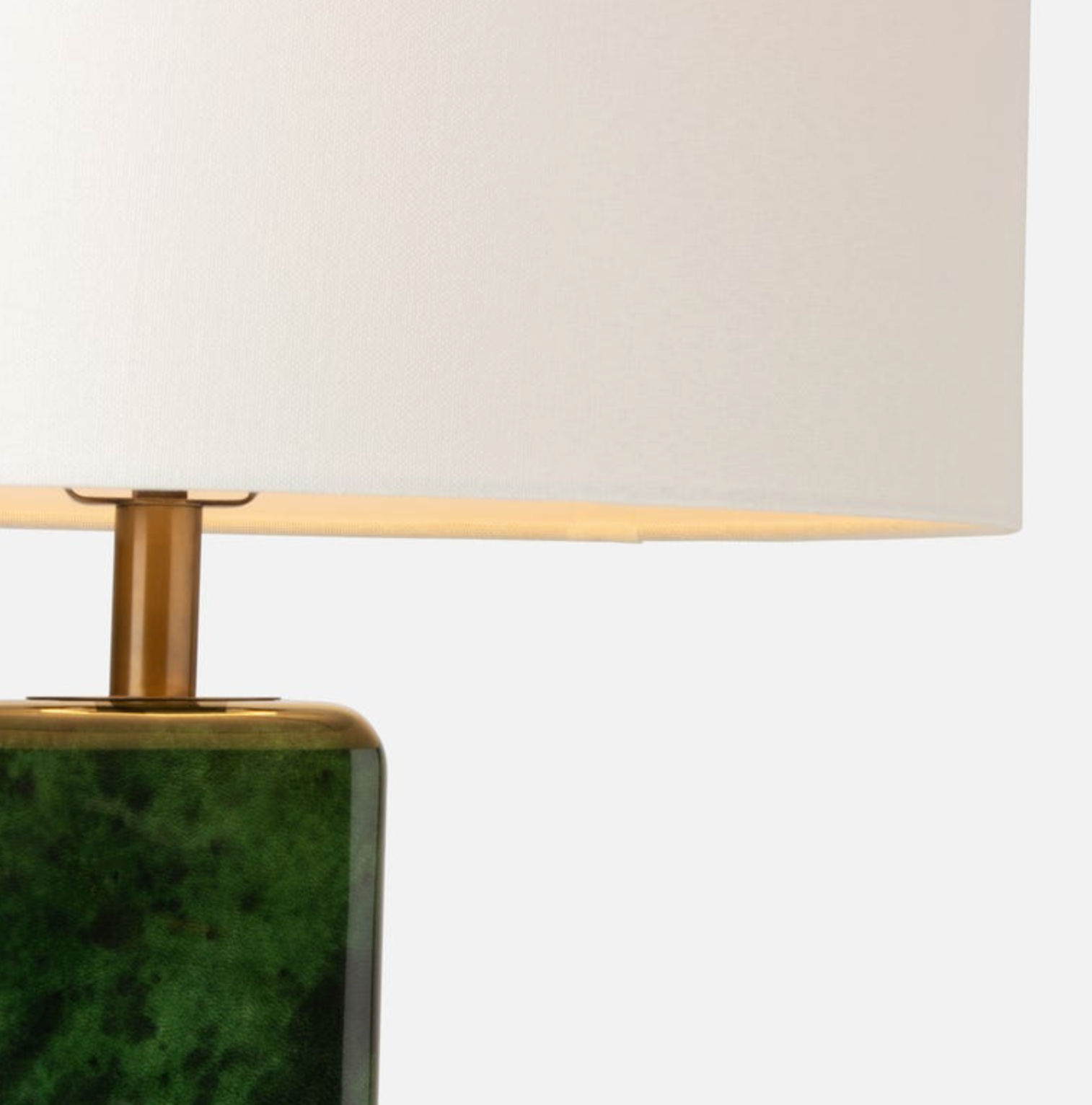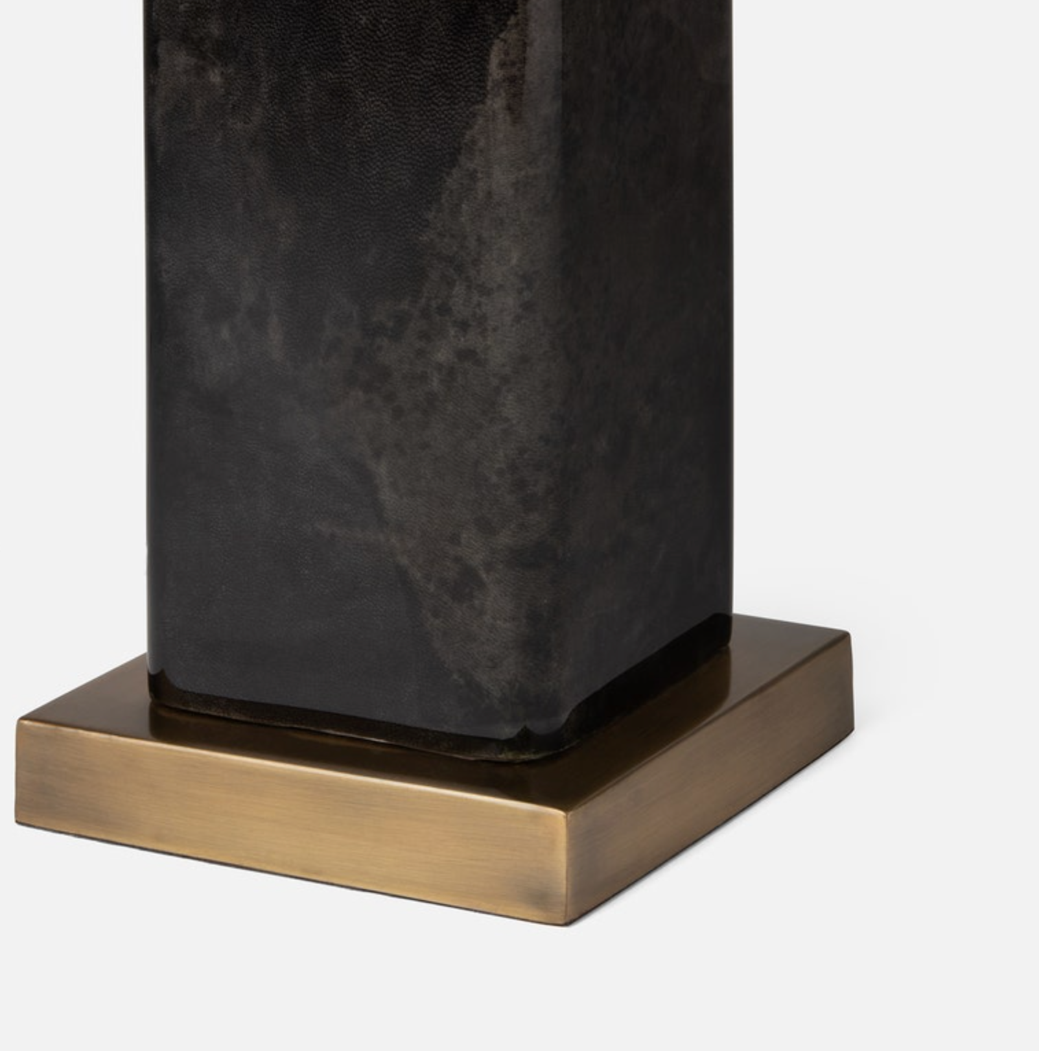 The Ripley table lamp has a column-shaped base with luxurious Emerald Gloss or Charcoal Gloss vellum leather, rounded edges, and accents of Antique Brass.