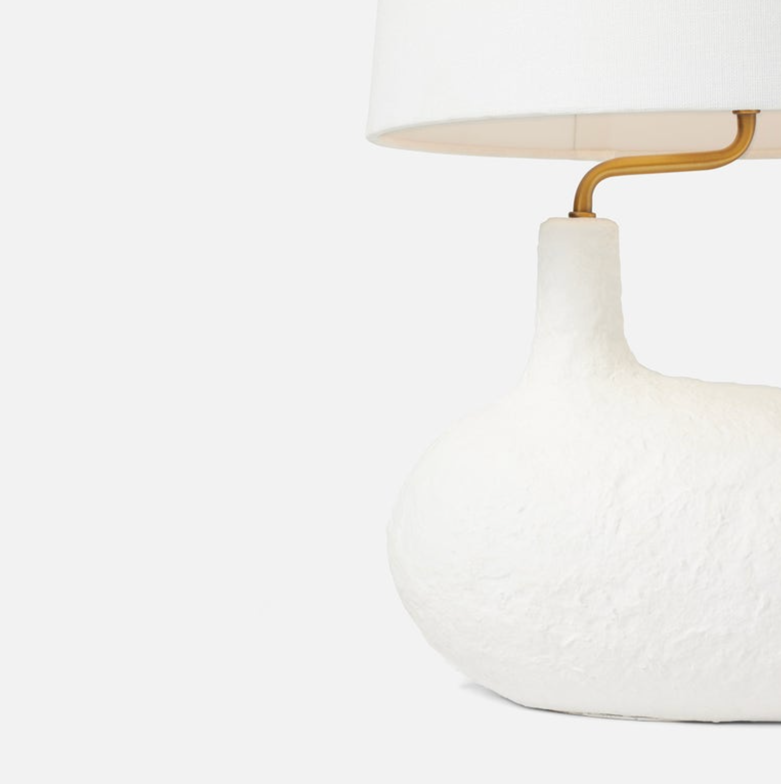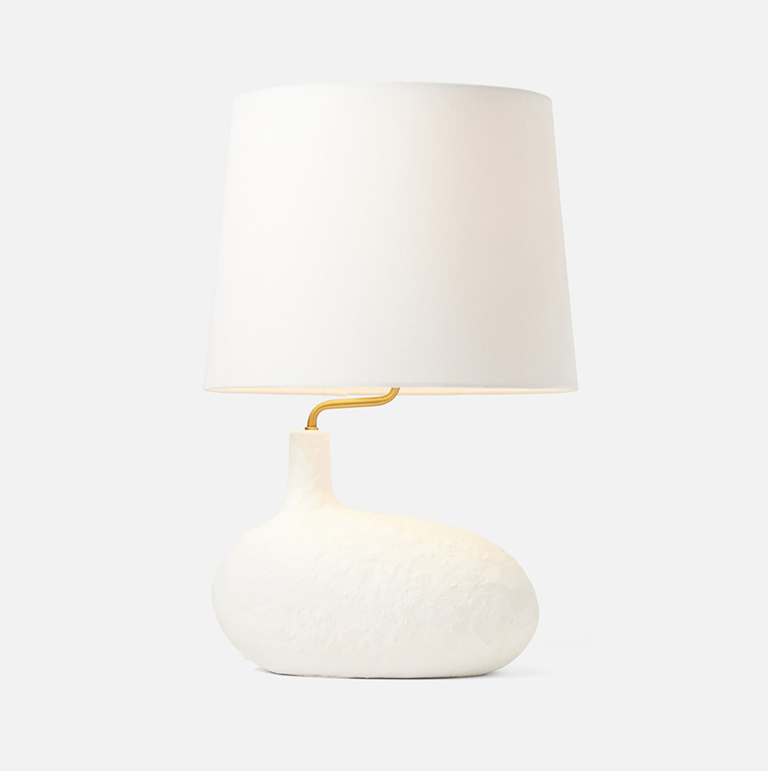 The small Tober table lamp has a base shaped like a textured pebble, and a neck that is askew yet offers a perfectly centered shade. It's a trick of the eye that quietly invites a hint of surrealism into any space.