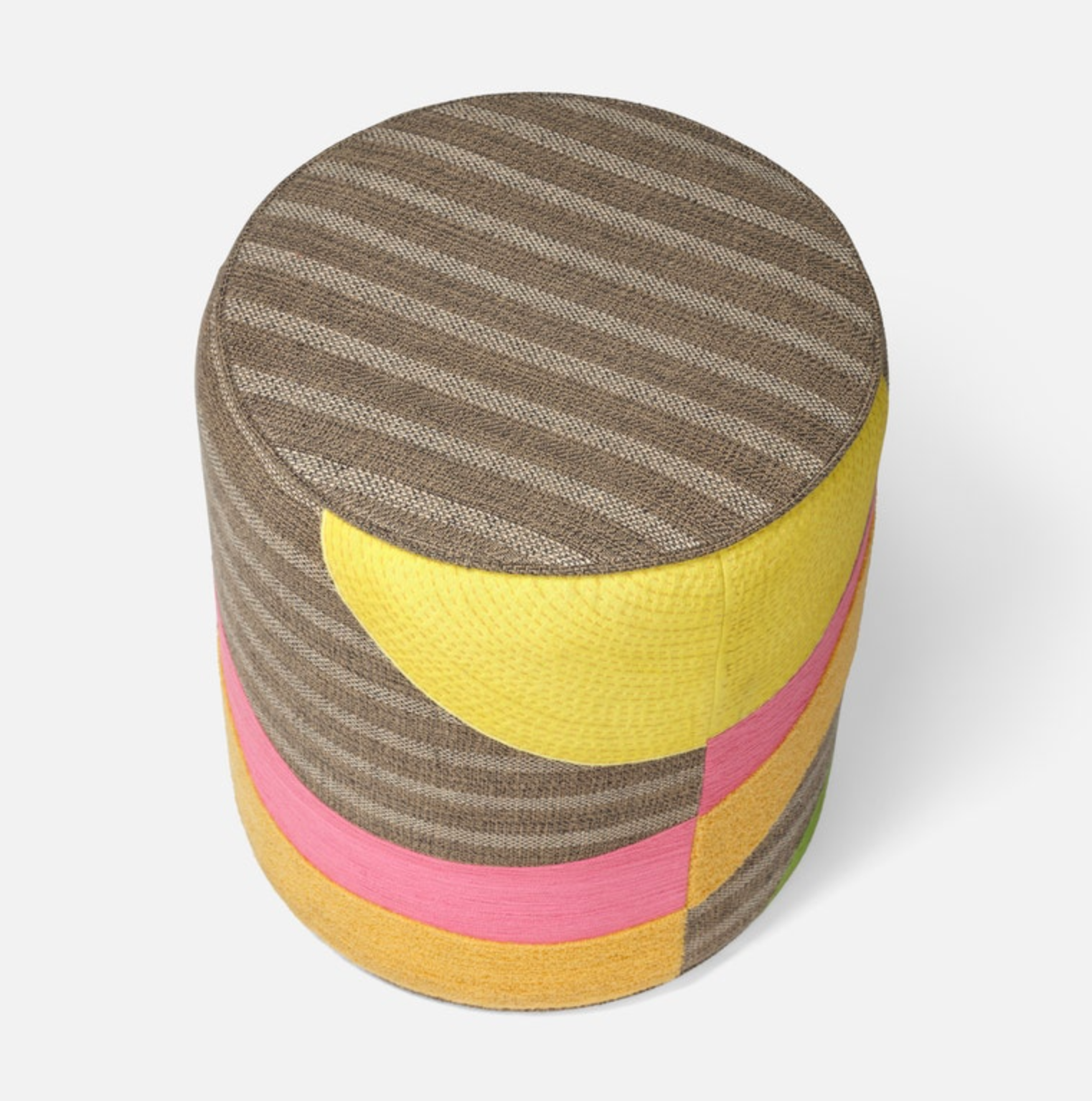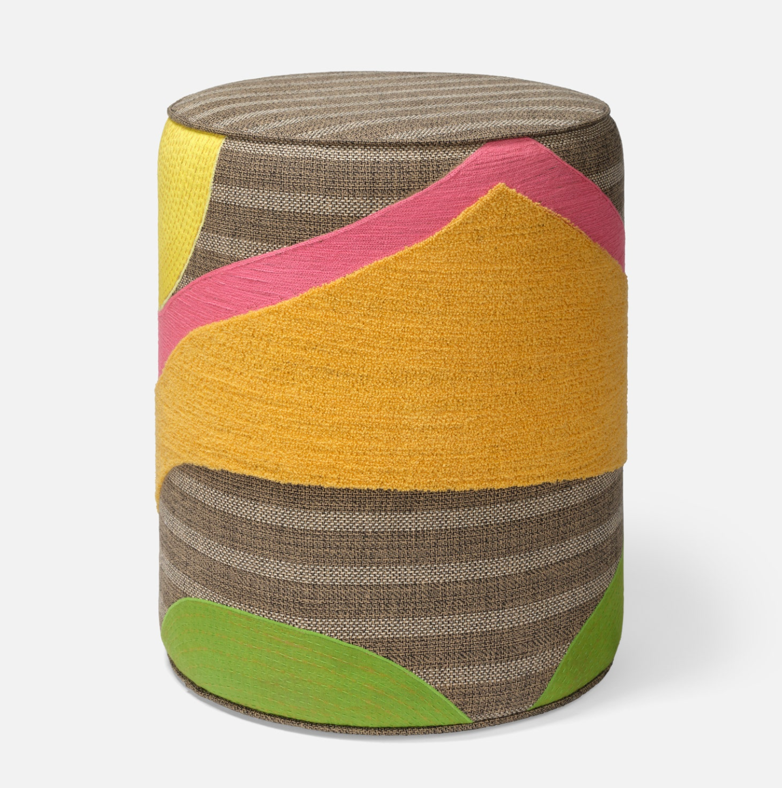 The Henriette stool boasts an abstract patchwork design, made of various fabrics, materials, and textures.