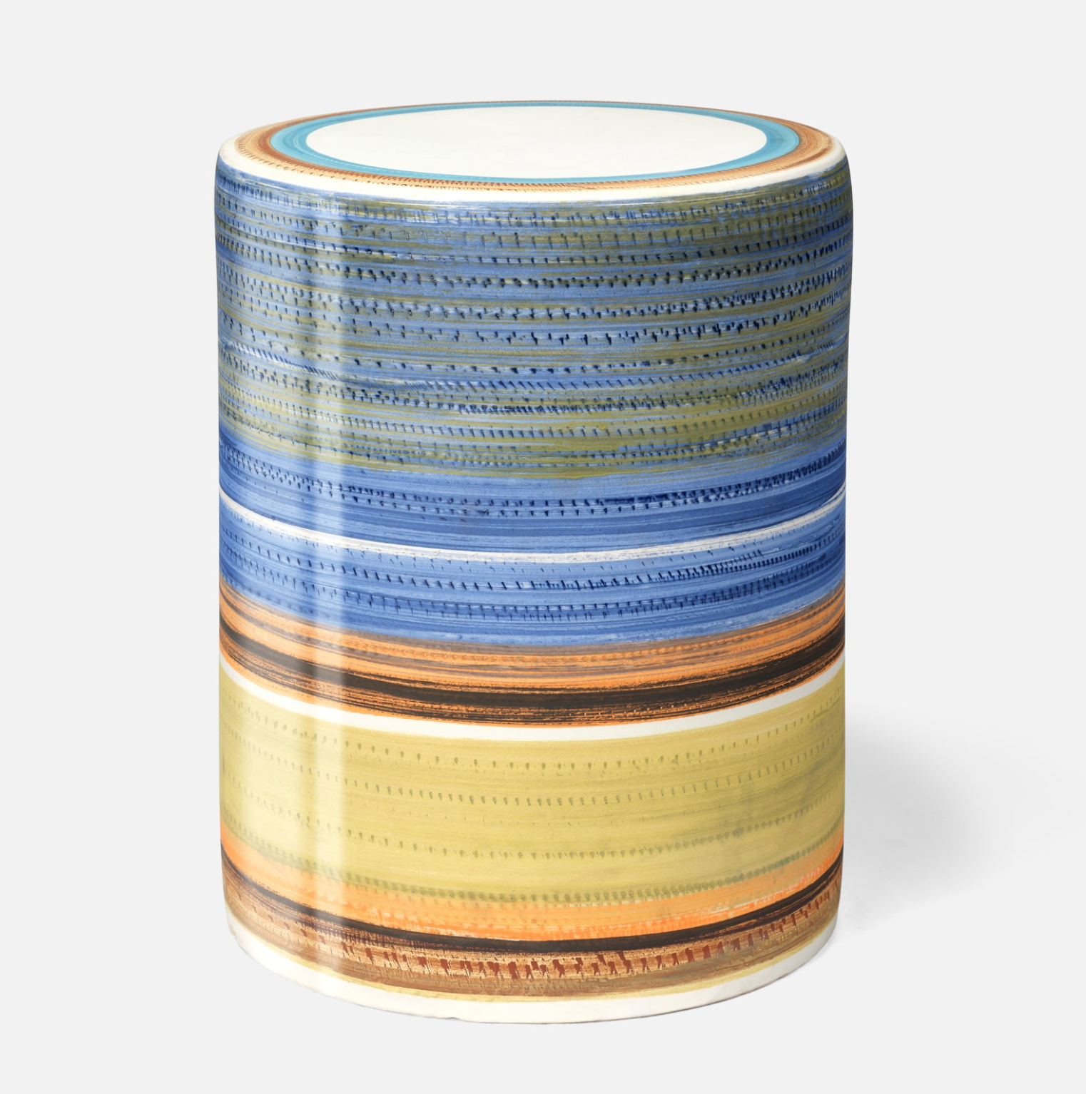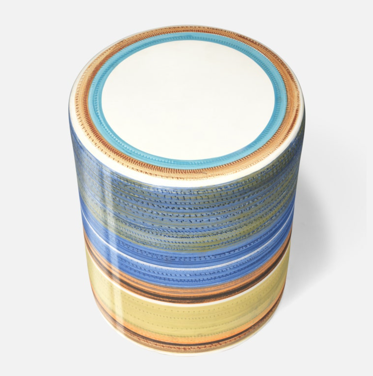 The Delta stool is handmade from ceramic and painted into multicolored striations in a glossy finish.