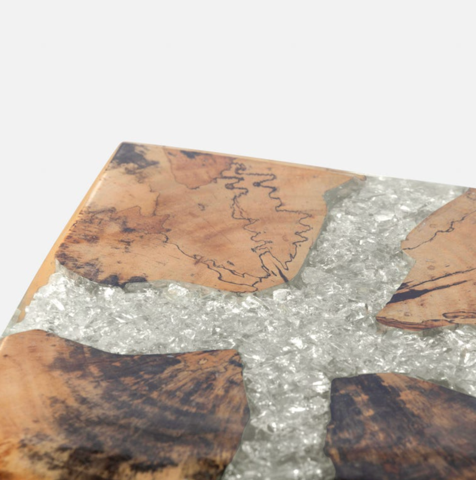 Tamarind wood is given a burst of dazzling energy with ribbons of clear resin chips. When light is reflected on these crystal-like pieces, the stool appears to glow.