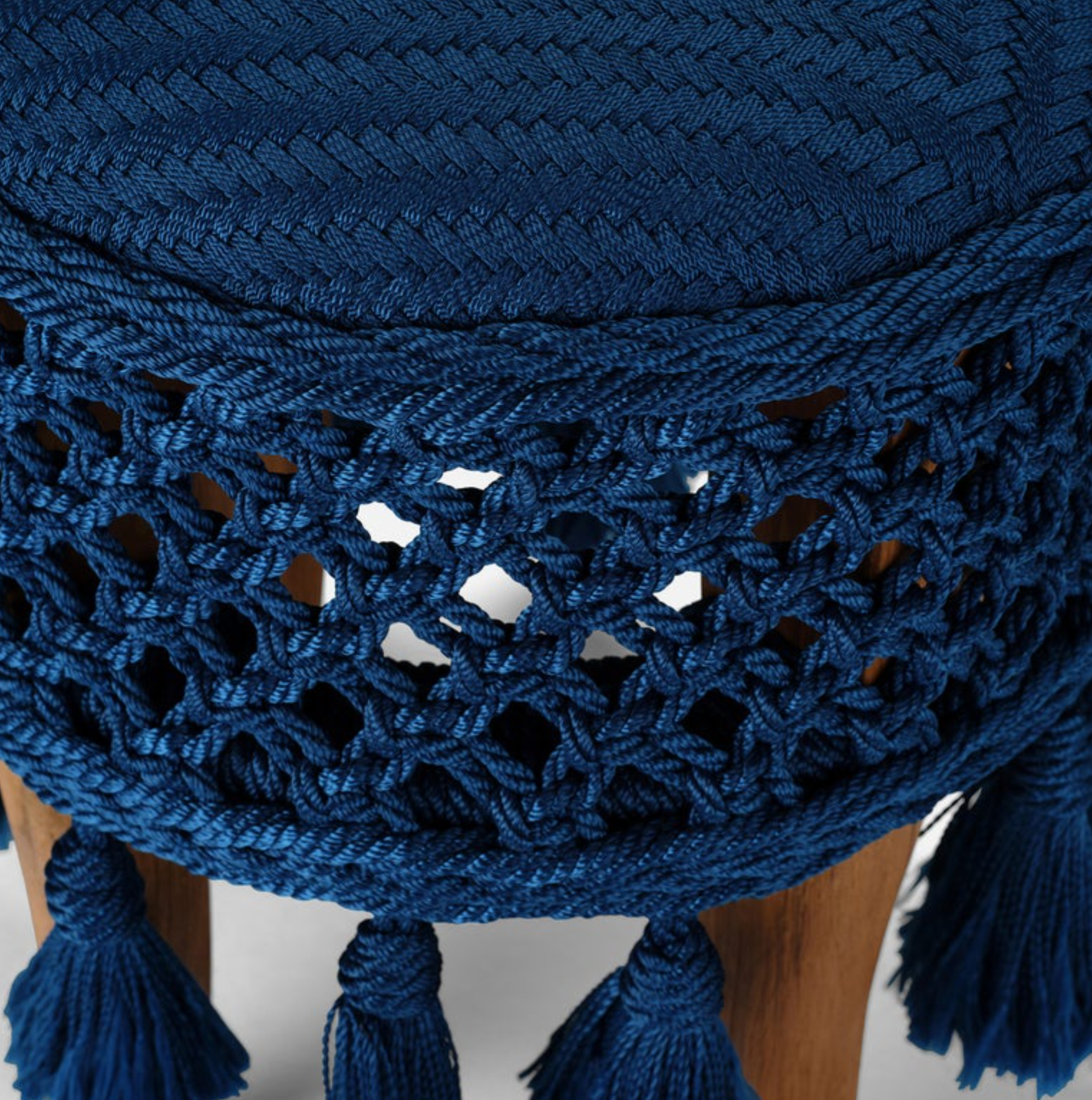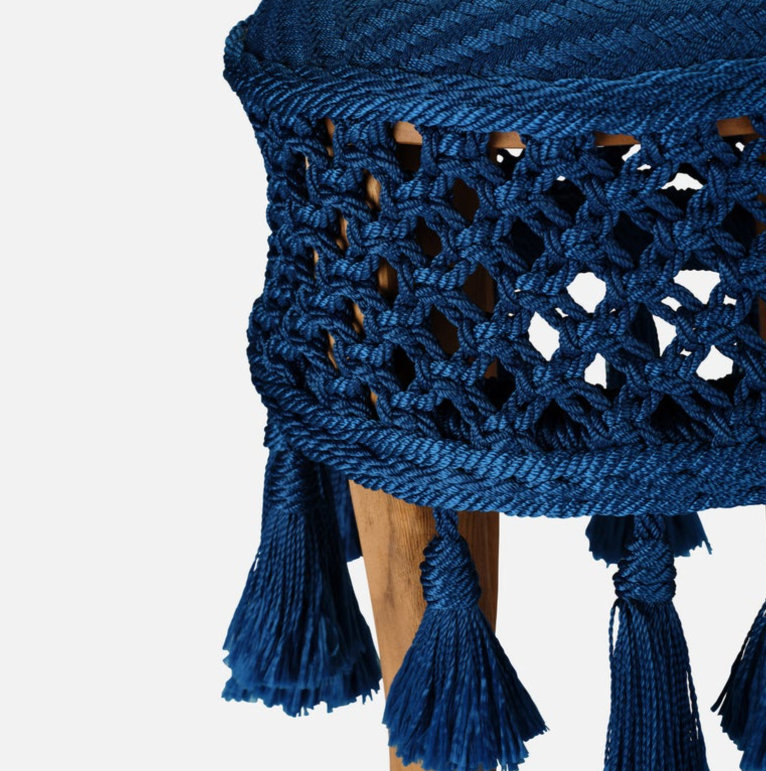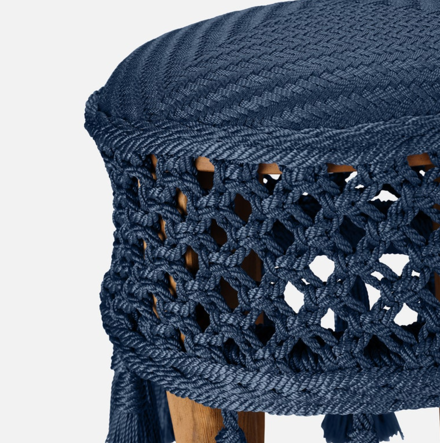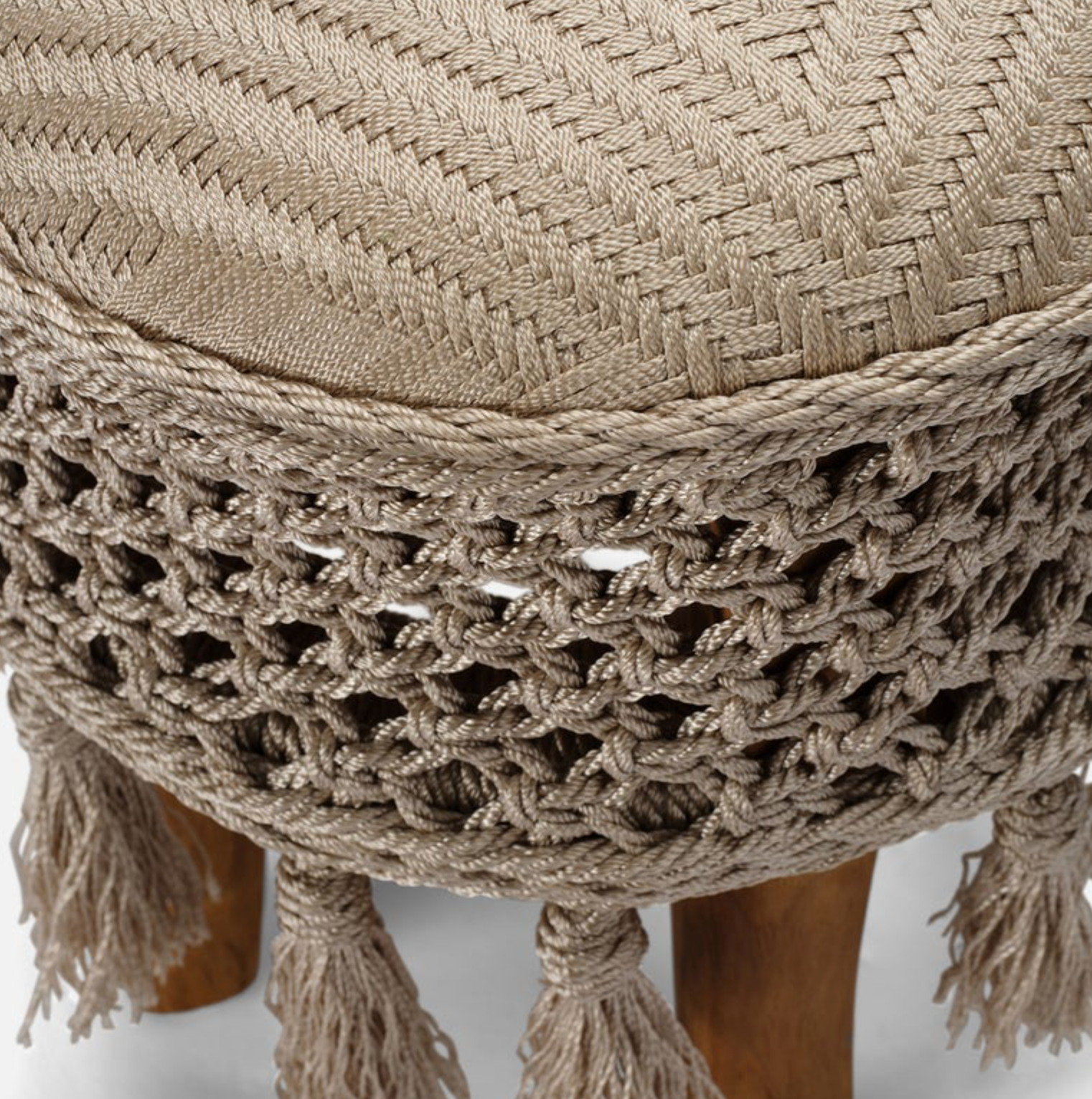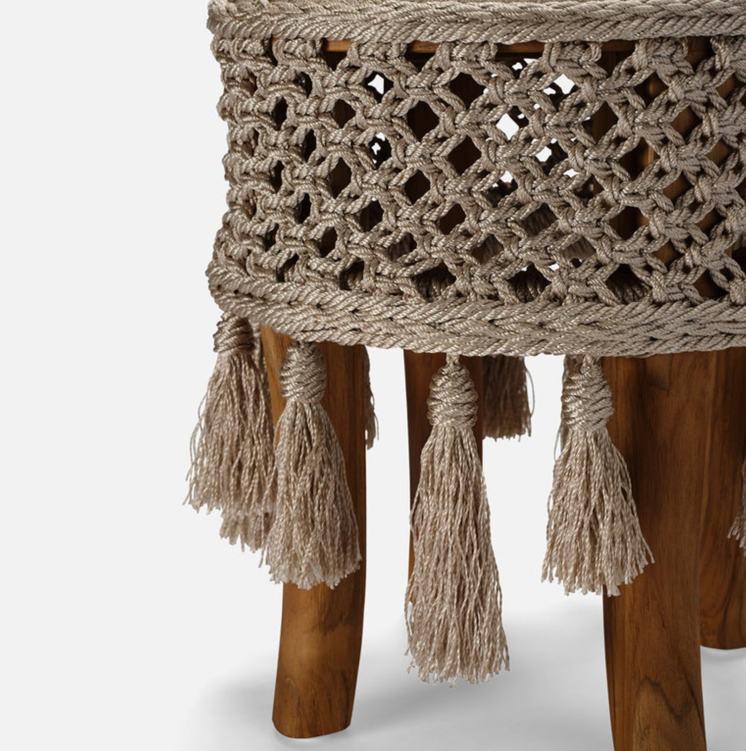 The Izzy stool stands gracefully on four legs, draped in performance macrame with intricate braided weaving. Tassels hang delicately from the edges, adding a touch of bohemian charm, while the plush seat provides a cozy and stylish place to rest.
