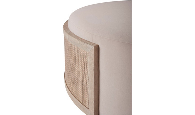 Tight seat ottoman featuring oak solid and quartered oak veneer panels with square mesh caning.