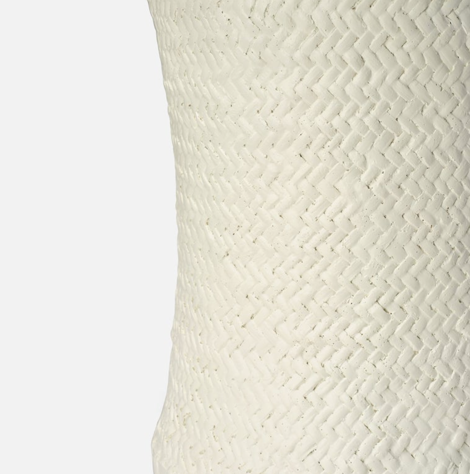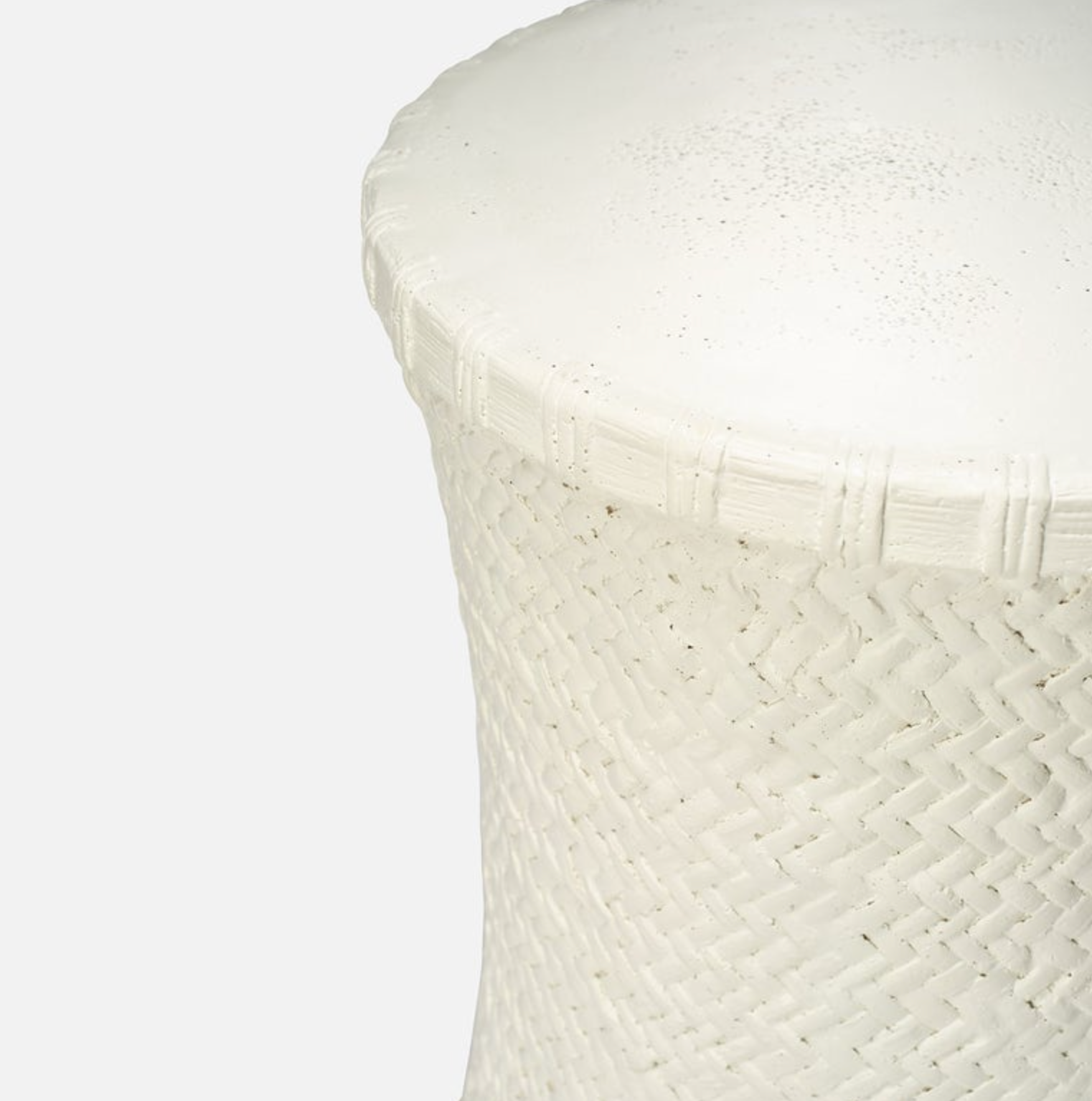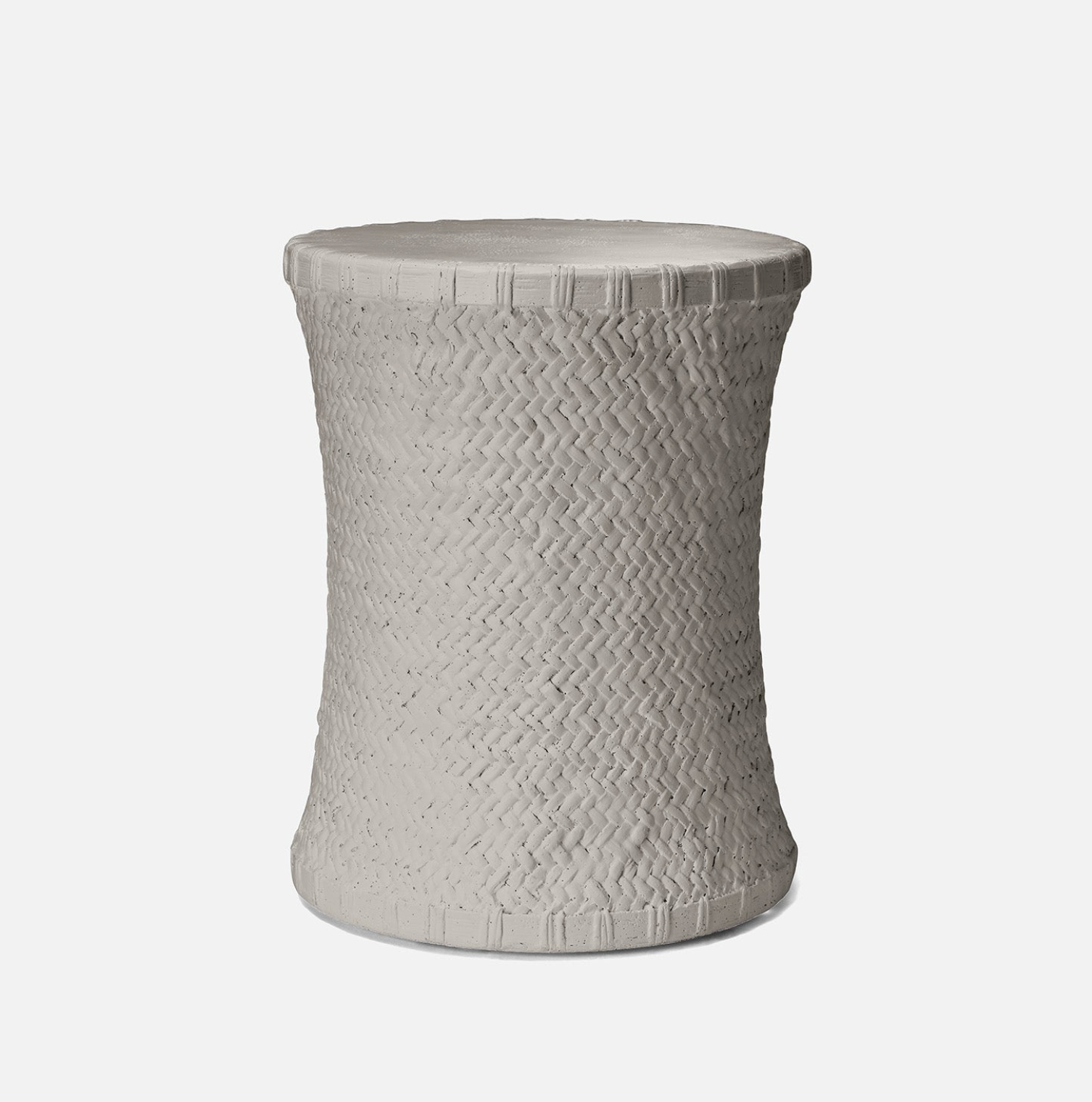 The stool is crafted from durable stonecast, featuring an intricate basket weave pattern on its base. Its subtle curved shape adds a touch of elegance.