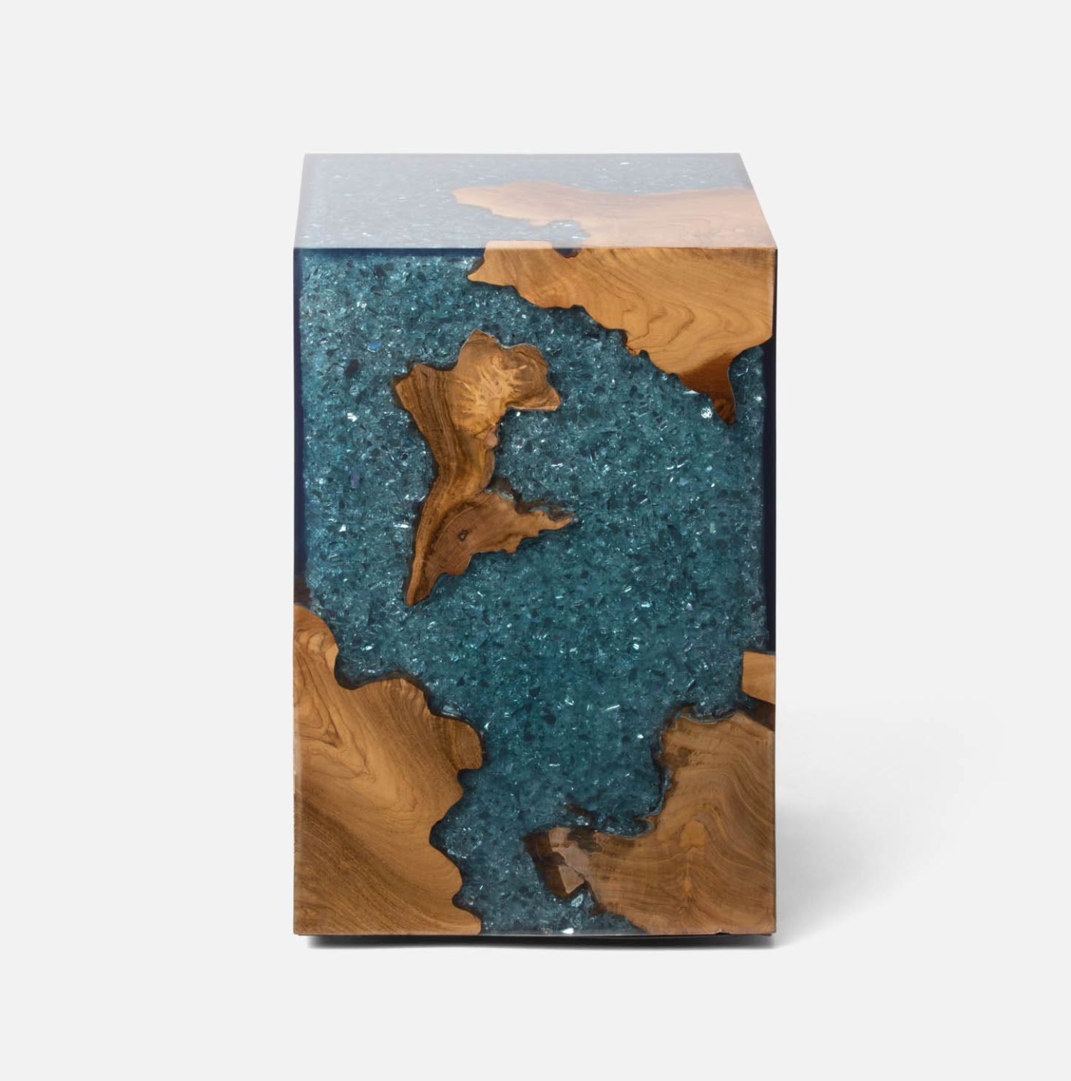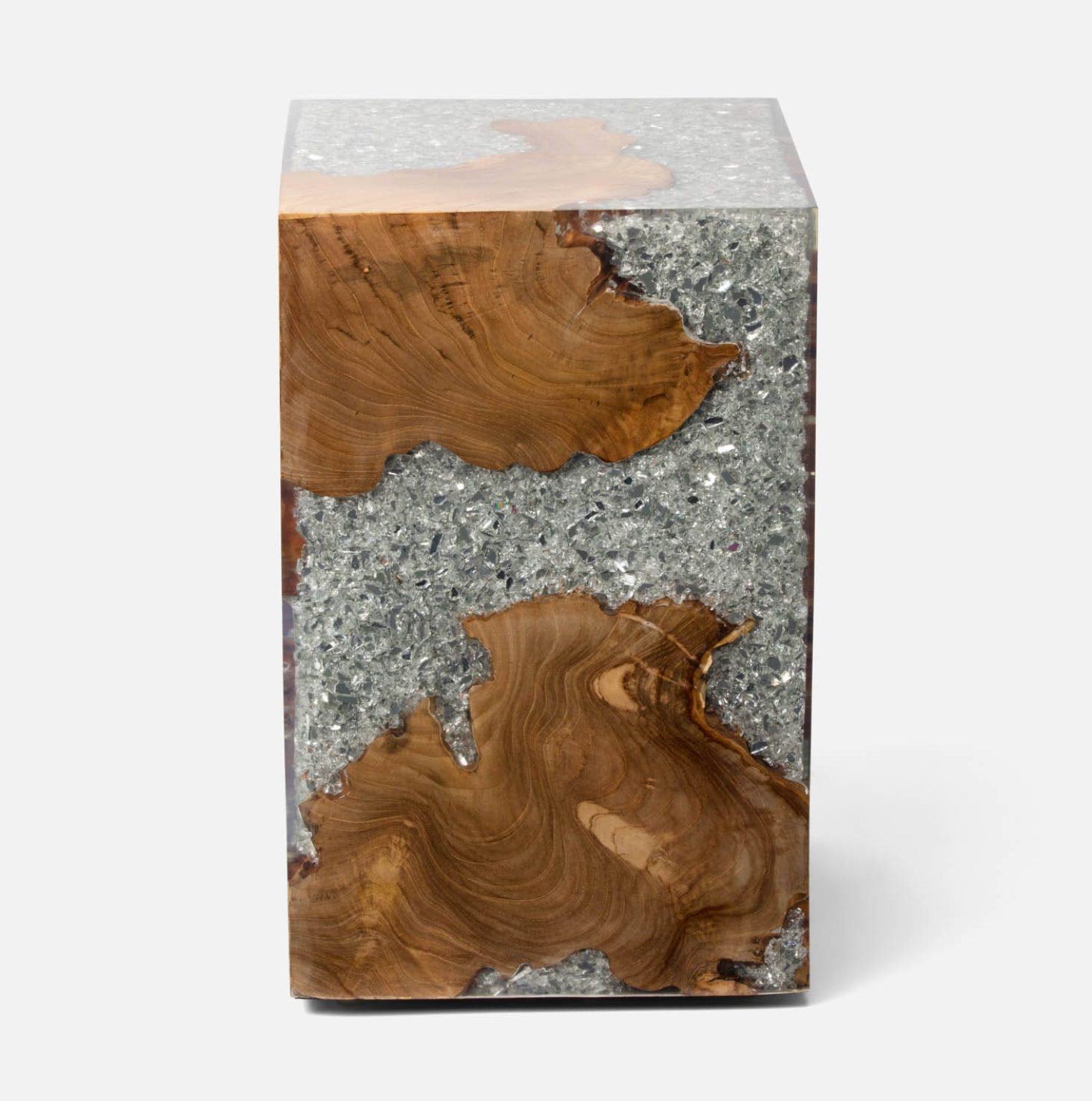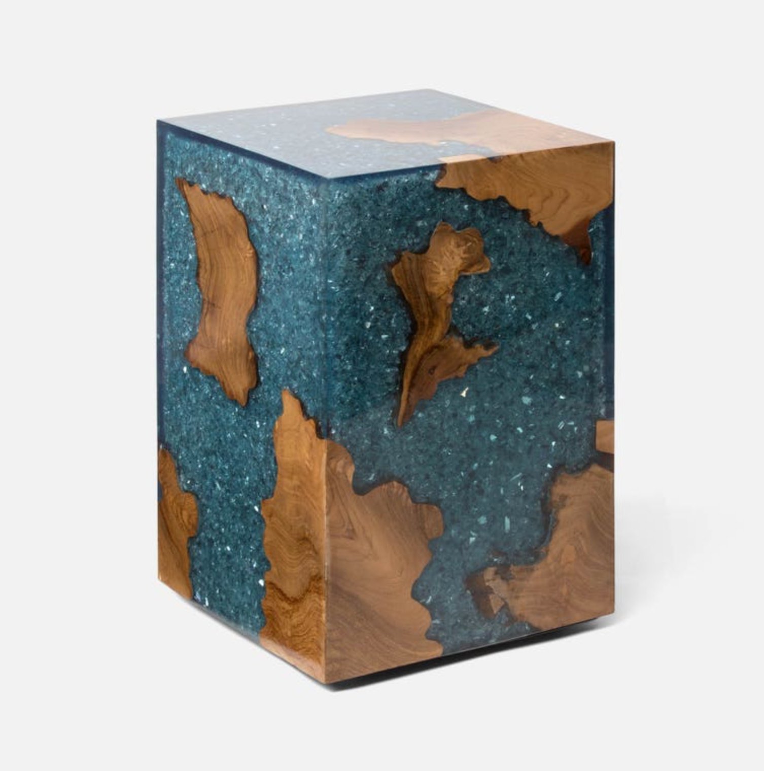 Vibrant stool features tiny glass pieces solidified in blue or silver resin set in teak.