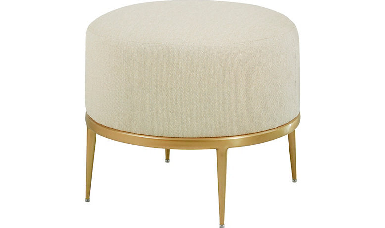 The Colette Ottoman's gentle curves and circular shape make it a fit for any room, from the dressing area to the bedroom and beyond. A curved bronze band and conical tapered legs support a circle of tight upholstery.