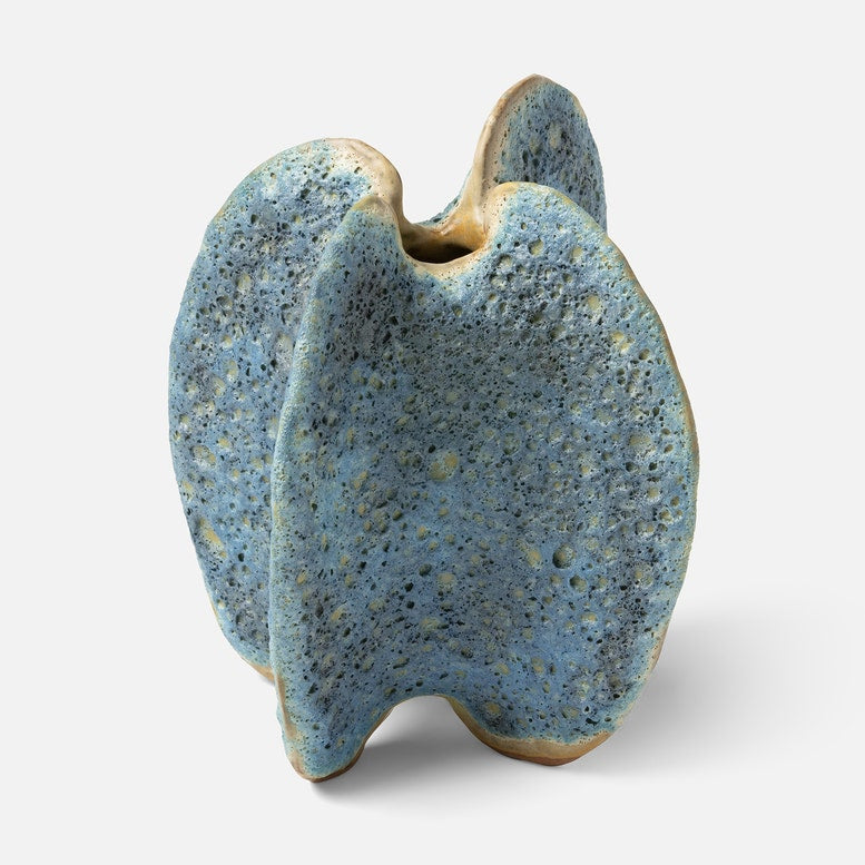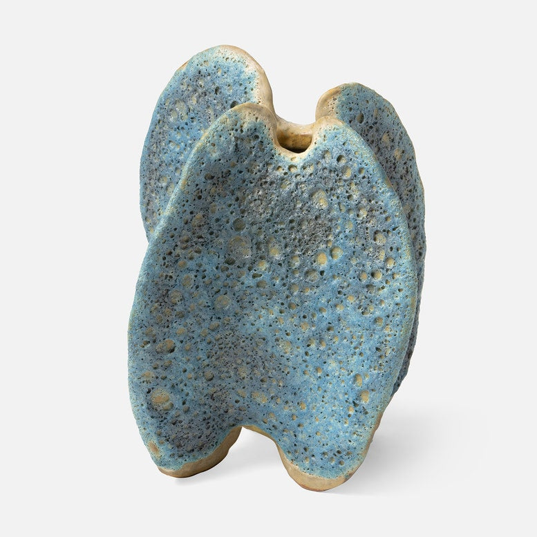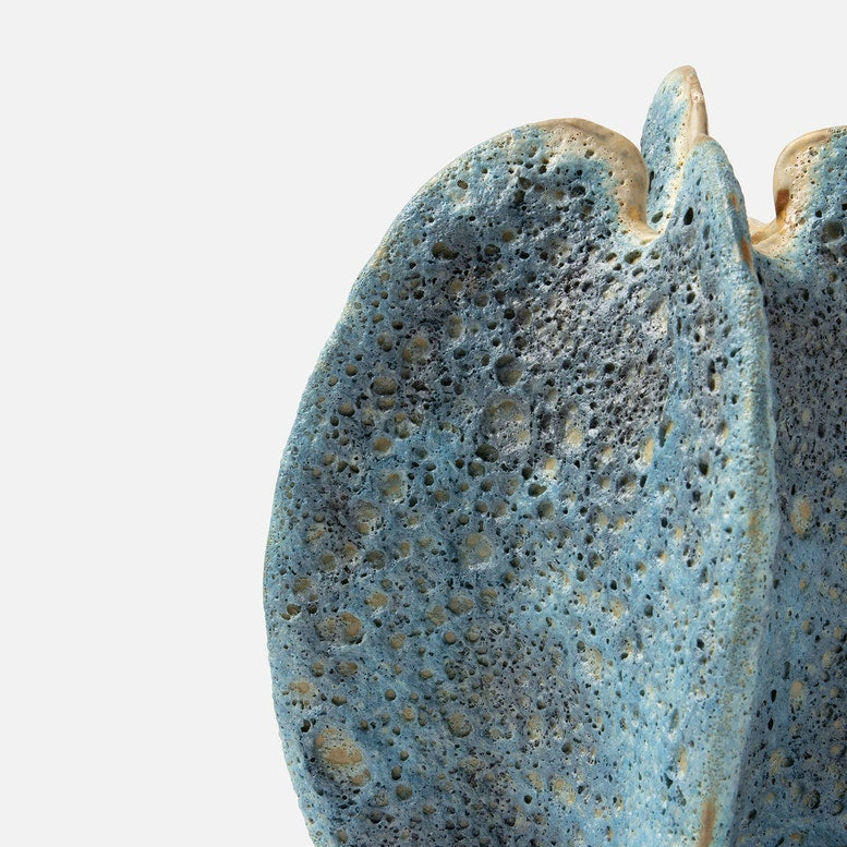 The delicate wings of this textured ceramic vase, washed in a variegated blue glaze, are inspired by the graceful movements of natural coral.