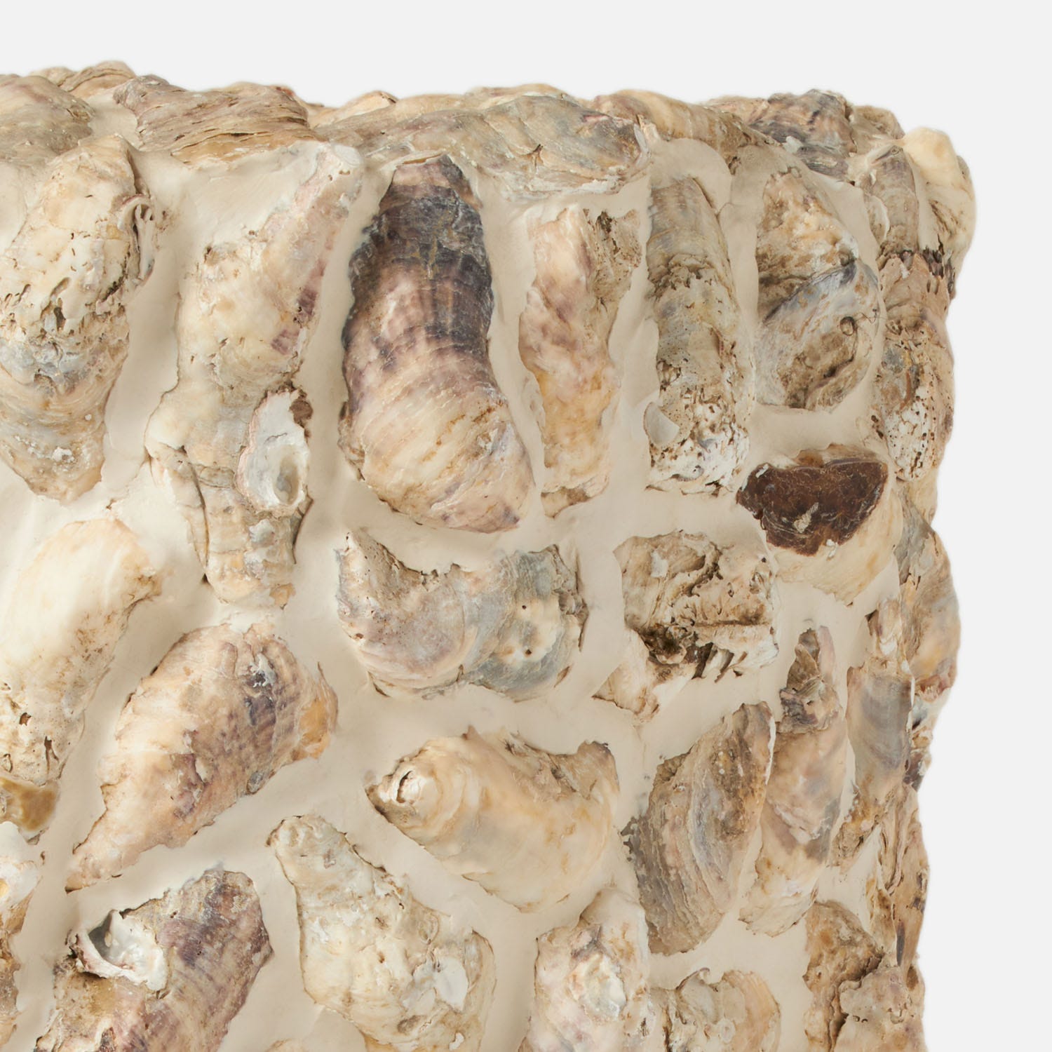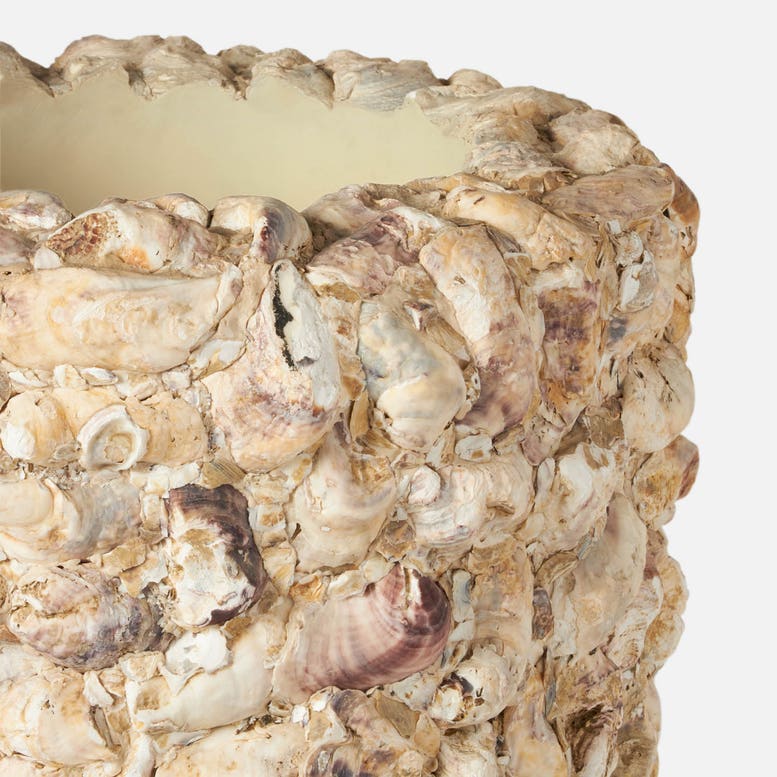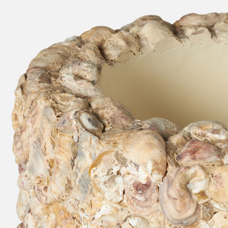 Piles of raw oyster shells take texture to new heights in Borsala, a convex planter. Each piece is one of a kind.
