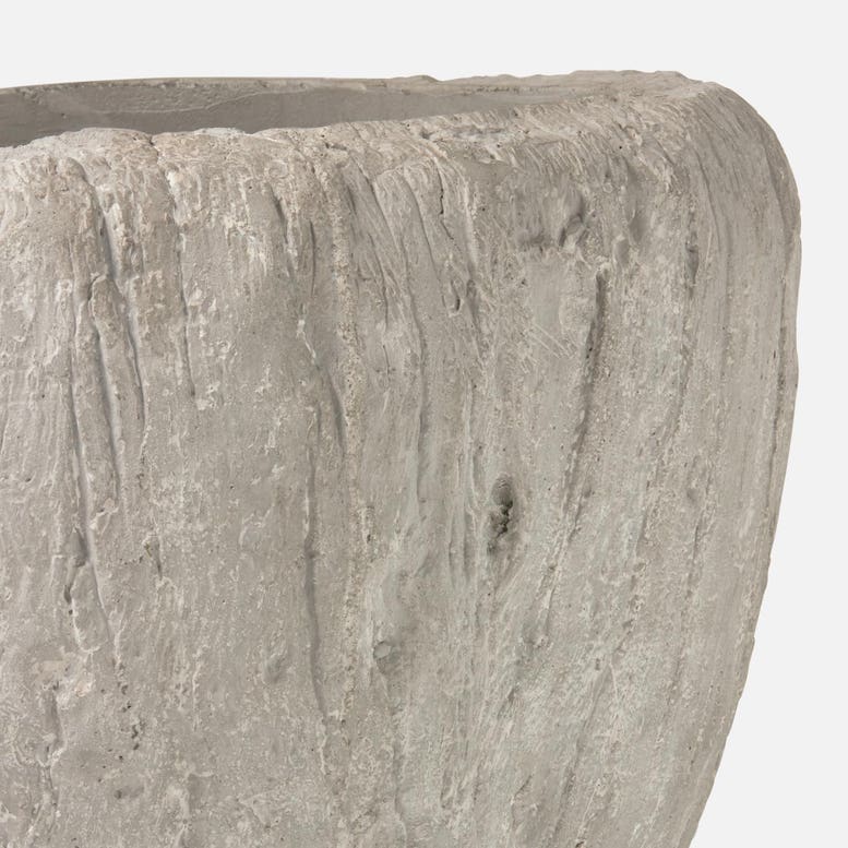 This large curved planter, made from whitewashed reinforced concrete, has a craggy texture and a hand-built quality — no two are alike. Reinforced concrete material naturally distresses. Minor cracks and imperfections are to be expected.