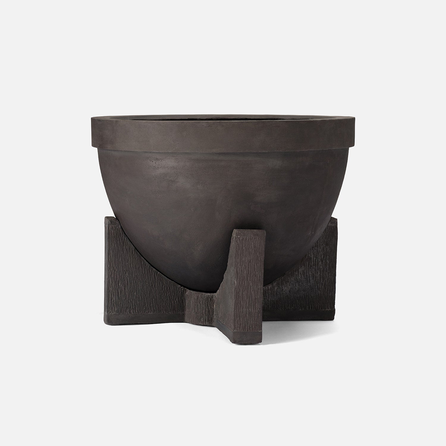This outdoor piece is perfect for patios, gardens, decks, and more. A wide-lipped bowl planter sits nestled into a three-pronged stand, elevated by its etched textural detail. Concrete material naturally distresses. Minor cracks and imperfections are to be expected.
