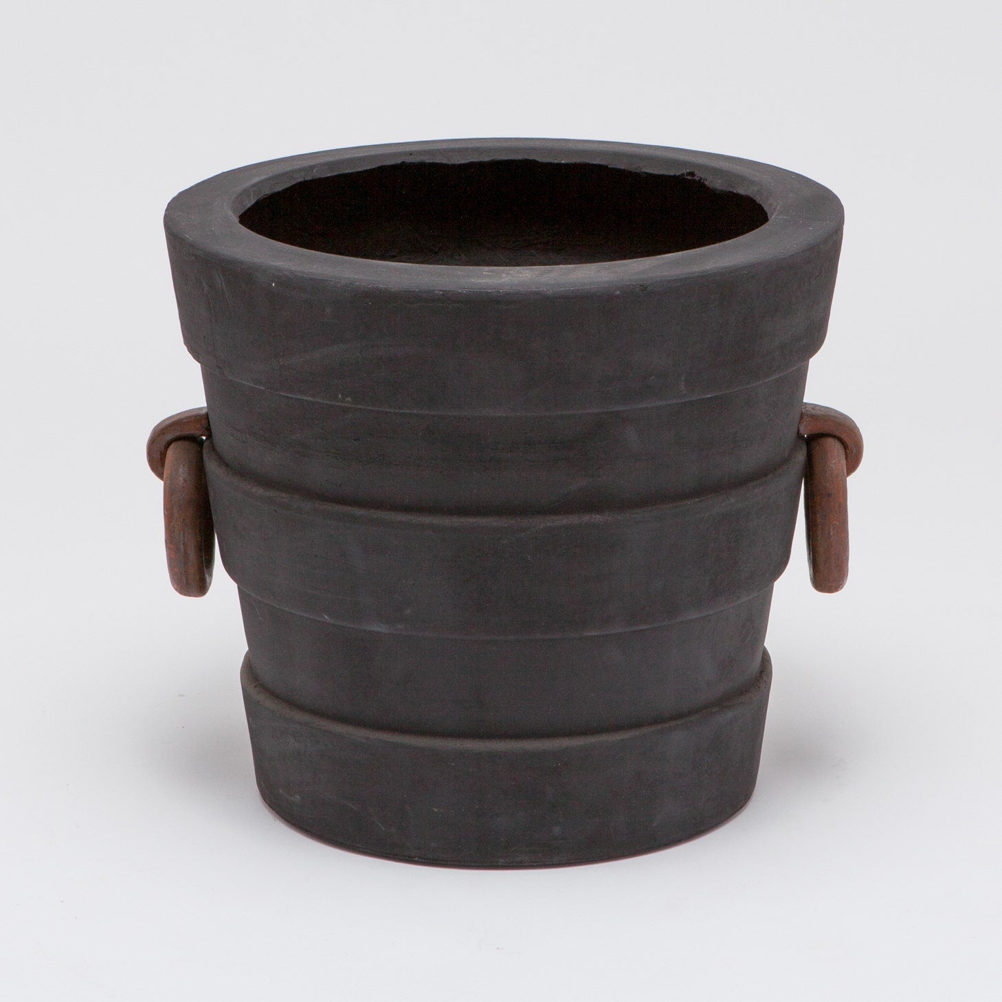 Oversized pots with decorative ring handles.
