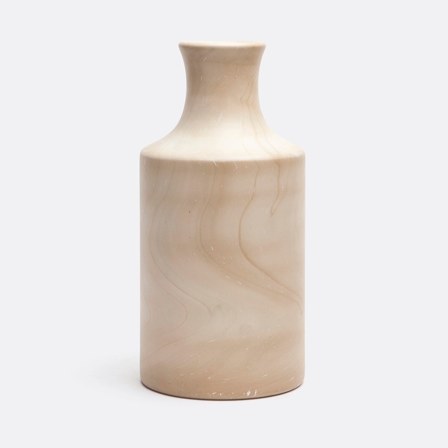 Smooth, classic mango wood vases, short and tall. The burnt version brings out the wood grain; the white stained Rivka resembles plaster or clay. For decorative use only.