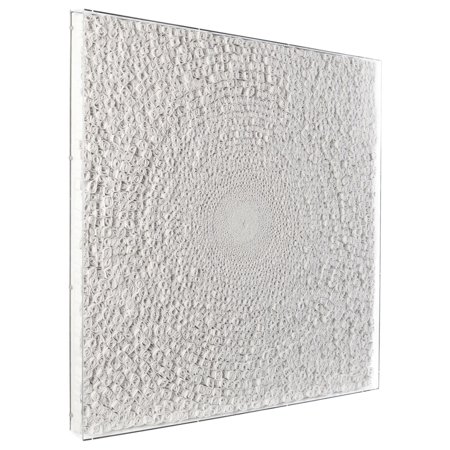 Eye of the Storm by artist Tony Fey is a mesmerizing piece of wall art that imbues an interior space with a stunning sense of depth and dimension. Hand-made from hundreds of individual rolls of paper atop canvas, the piece showcases intricate spirals that get smaller as the design reaches the center. The piece is displayed within a clear acrylic box and affixed with keyhole hangers.