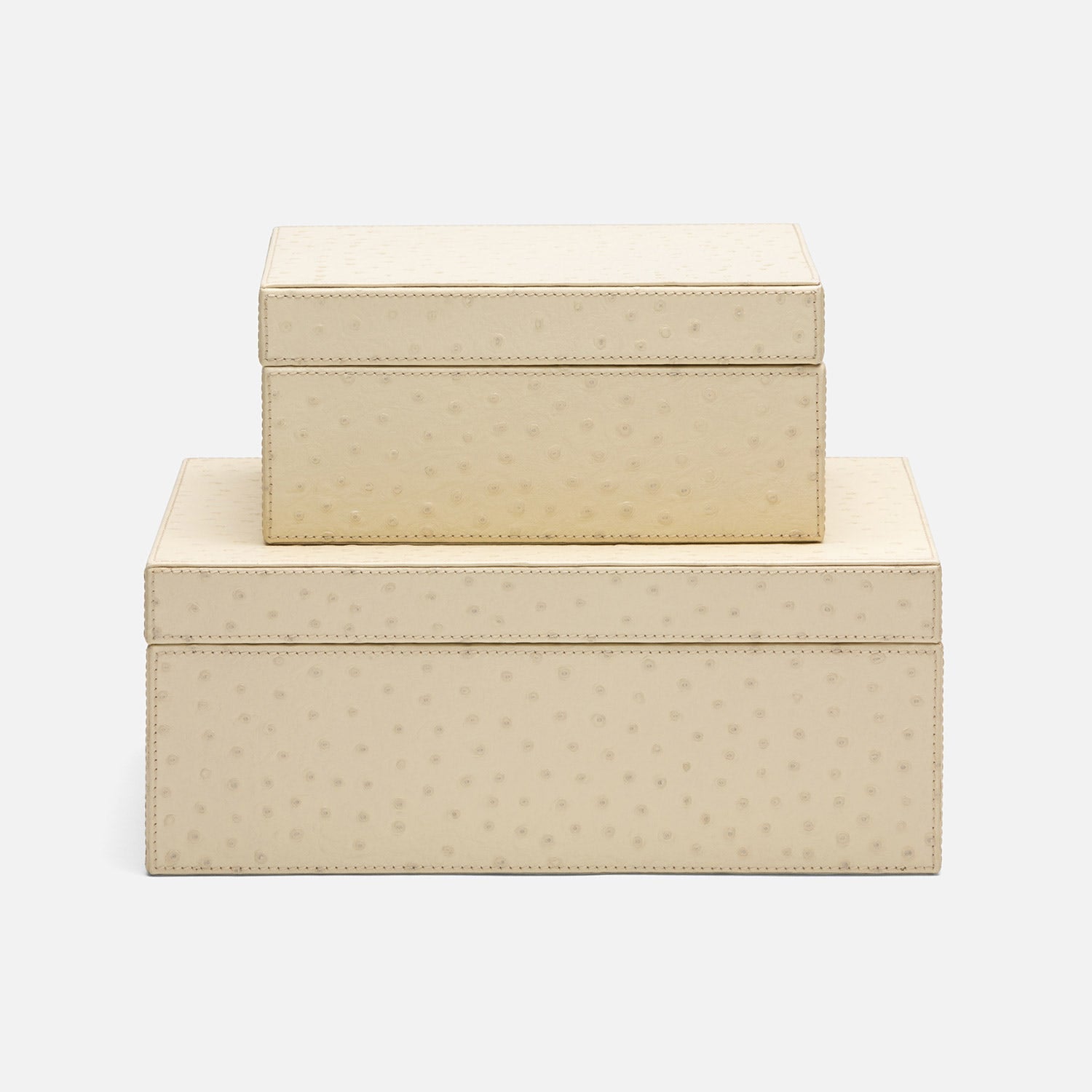 Cream ostrich leather boxes. Natural variations in this material may occur. Slight differences in color and texture are characteristics of this collection's aged full-grain leather. This durable, high quality leather may show inherent markings, distressed appearance, and variations in pattern.