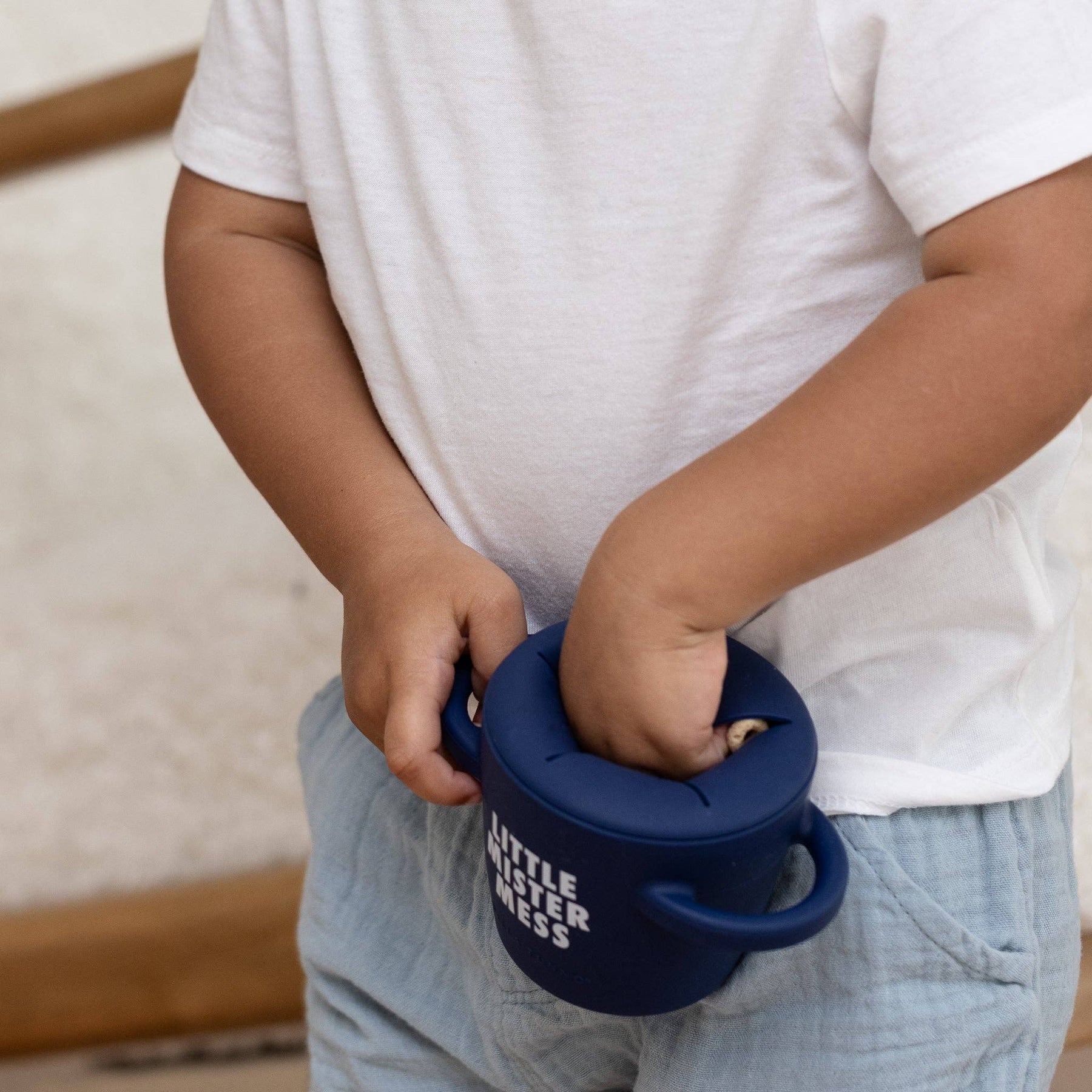 The Happy Snacker is a first-of-its-kind two-piece silicone snack cup with a mess-proof snap-tight lid and soft silicone opening so little hands can easily access food and prevent spills. Designed with easy-grip handles, it fits in car seats and stroller cup holders.