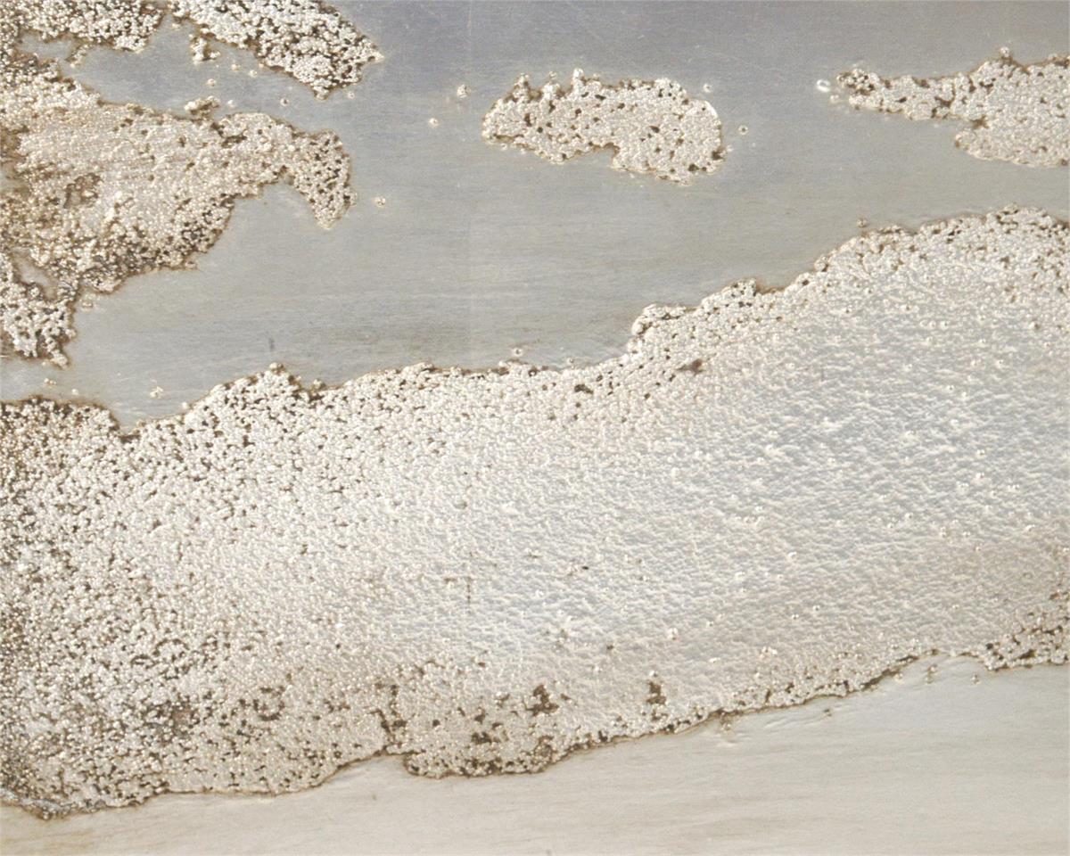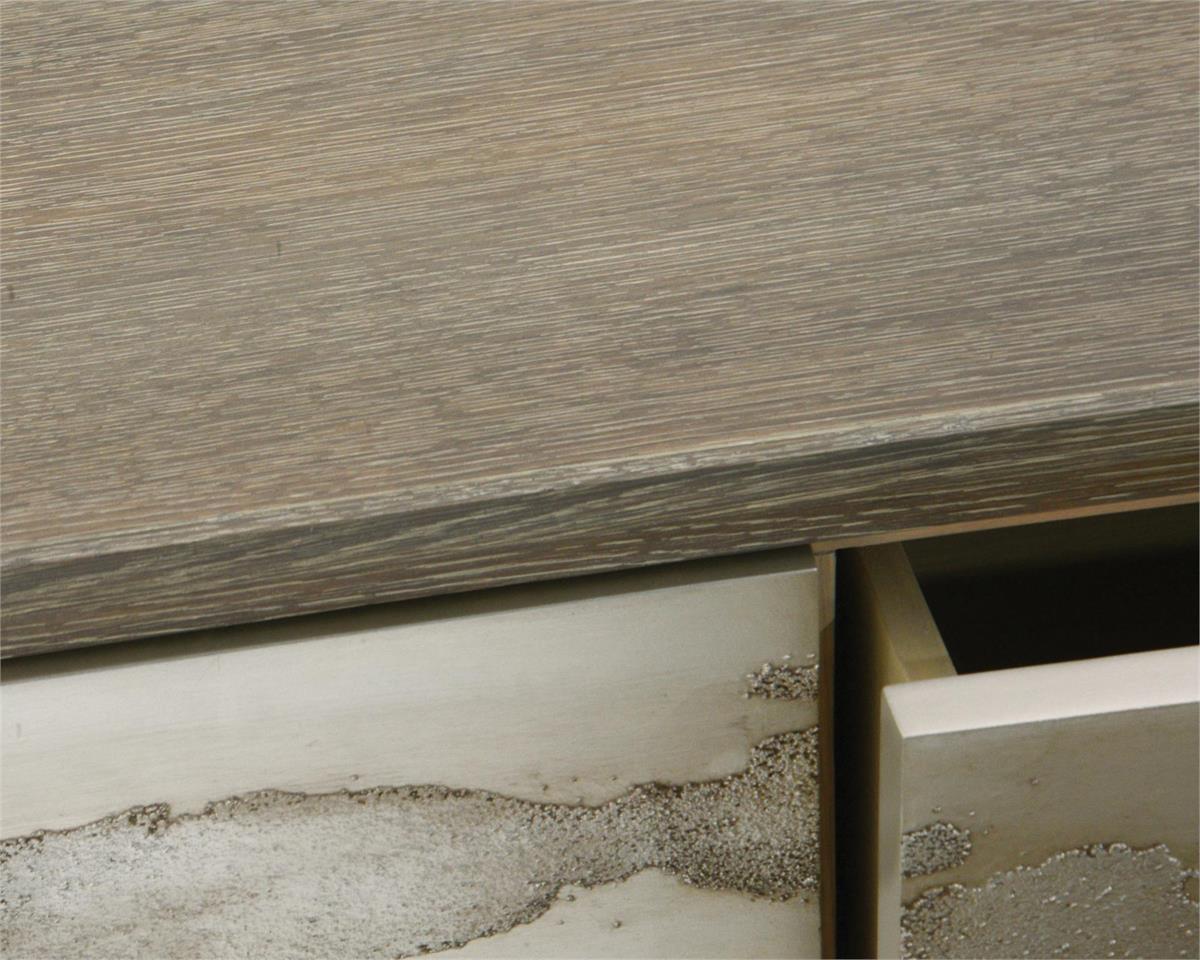 The Sideboard in American white oak features center storage between two columns of three drawers each. The case is finished in driftwood and set on a base in brushed stainless steel. The entire front is finished in Truro silver leaf over a raised, textured pattern.