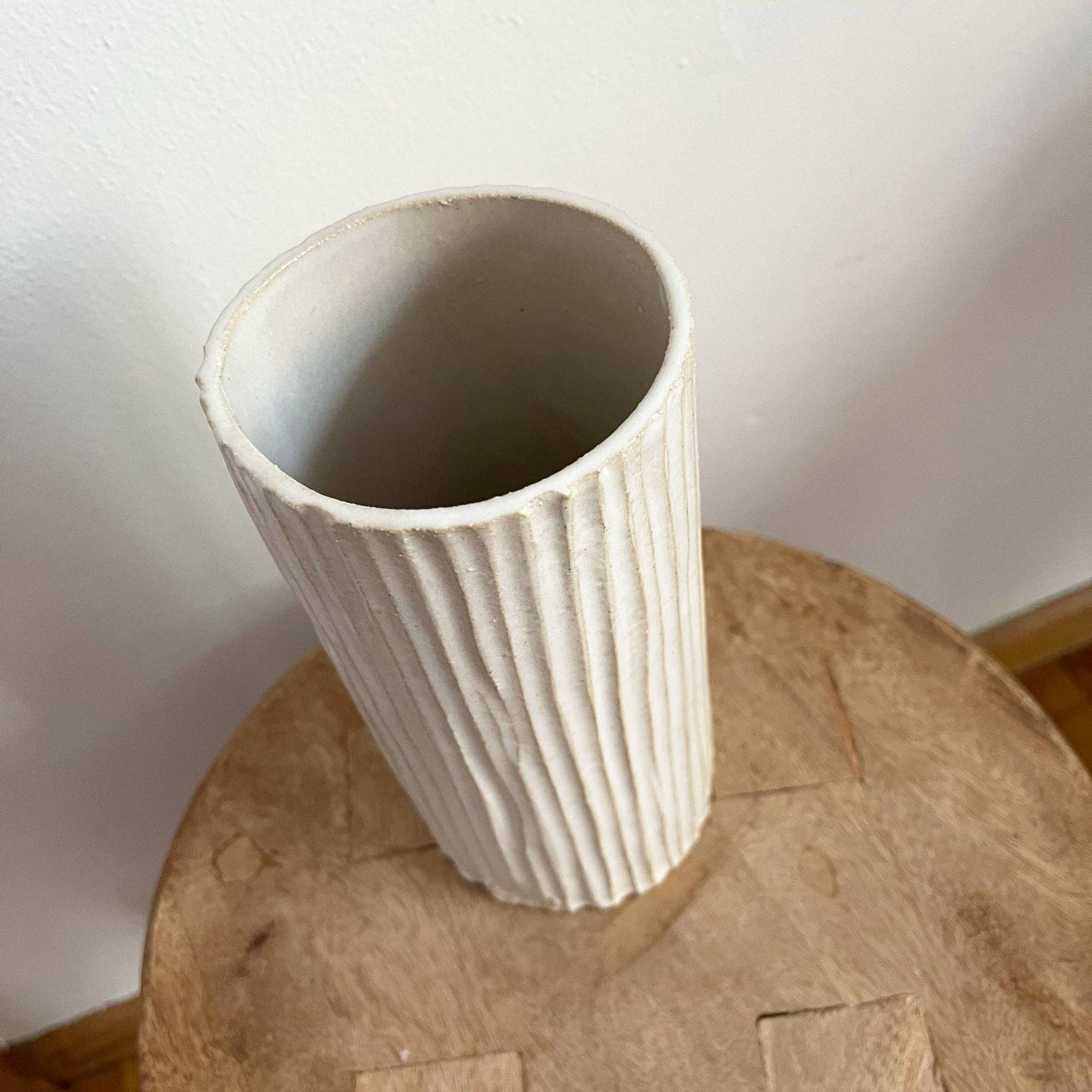 An irregular hand-carved texture on a taller-than-usual cylindrical vase body.