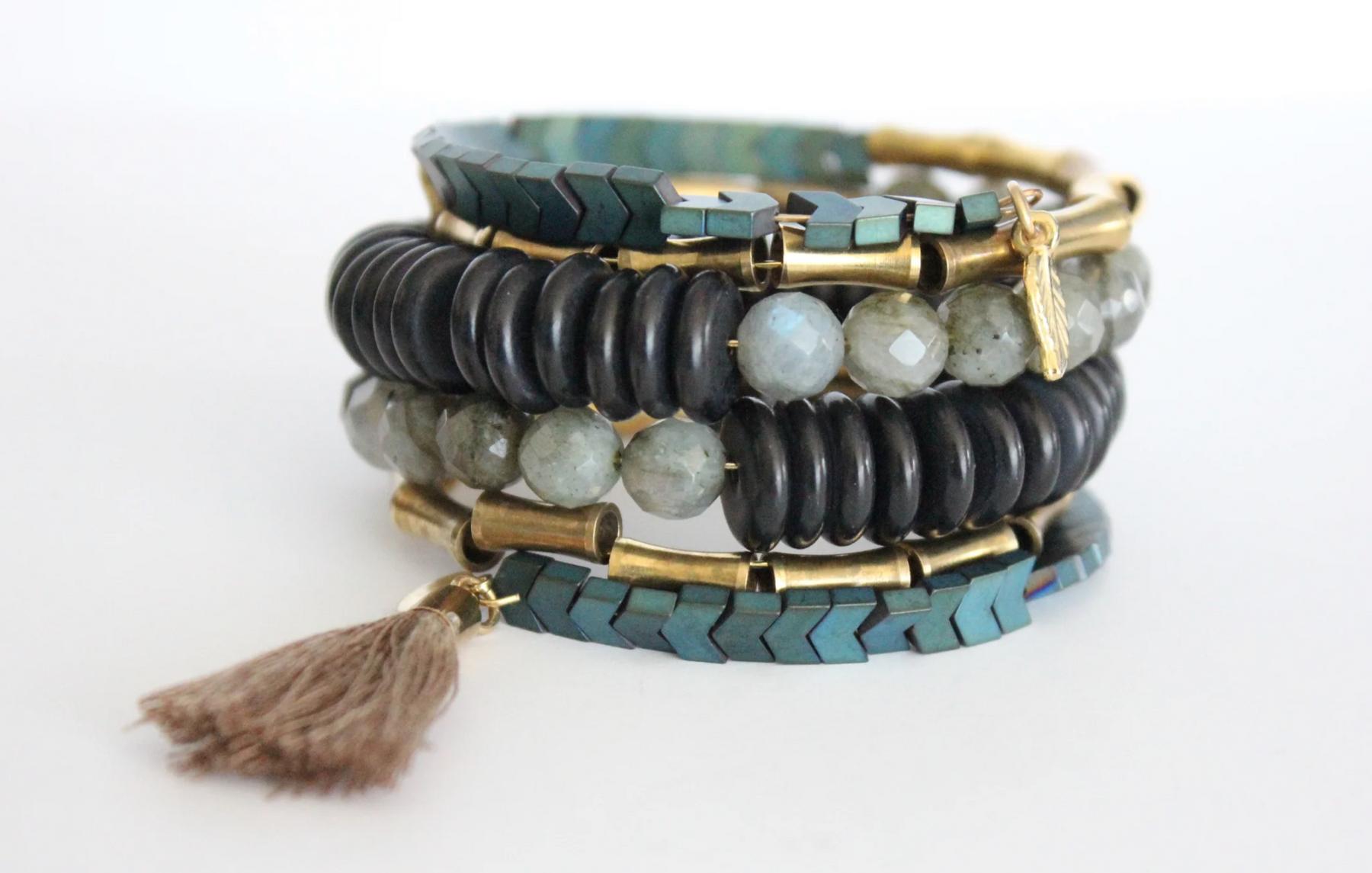 Wrap bracelet with magnesite, plated hematite, labradorite, and brass beads.
