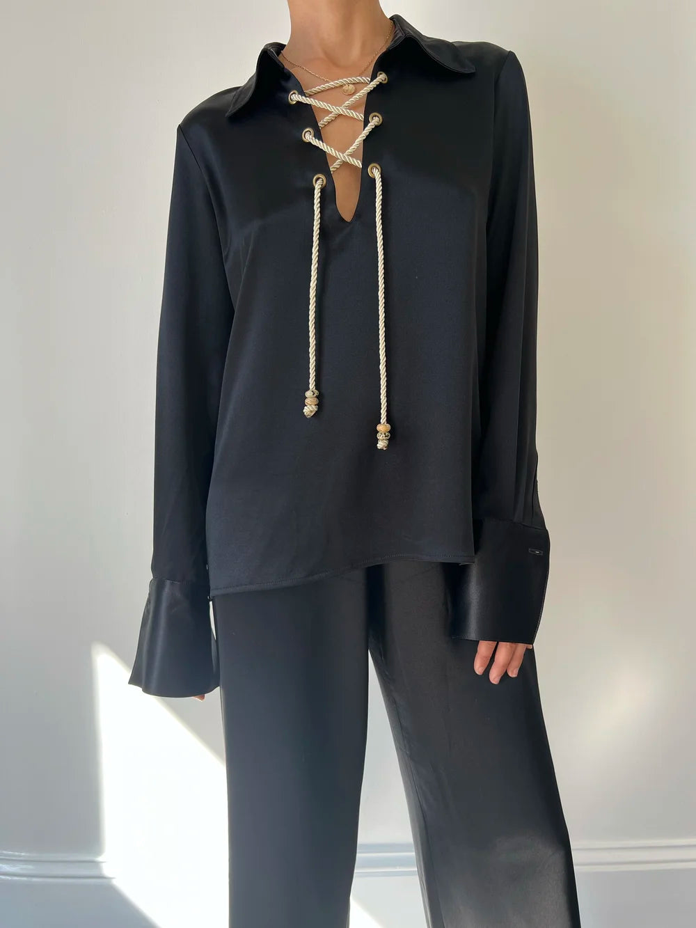 An essential with an edge… This Honeycomb color is electric … a super luxe top is constructed in silk crepe back satin with our signature elongated cuffs and a rope tie detail embellished with beads. An understatedly sexy essential that can be paired with denim or our signature De Terre silk pant. Impeccable artistry locked in.