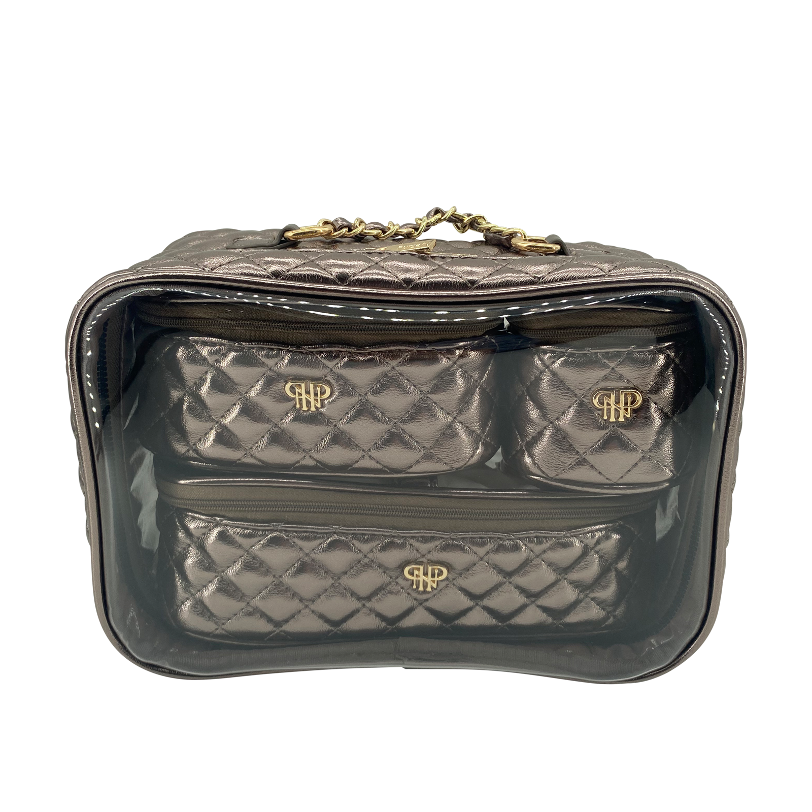 The Trio Jet Setter is your four-in-one answer to beauty on the go - elegant, organized, and effortlessly chic. The quilted metallic Bronze takes sophisticated to a whole new level. Inside the clear, structured case with designer inspired chain handle are three removable companion cases (extra small, small, and medium), perfectly sized to keep your makeup, skincare, and everyday essentials in flawless order. Whether you're heading to the office, the gym, or a weekend escape, the Trio Jet Setter keeps everything in place - and your routine looking fabulous every step of the way.