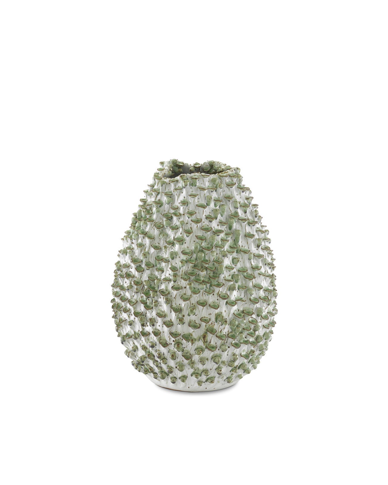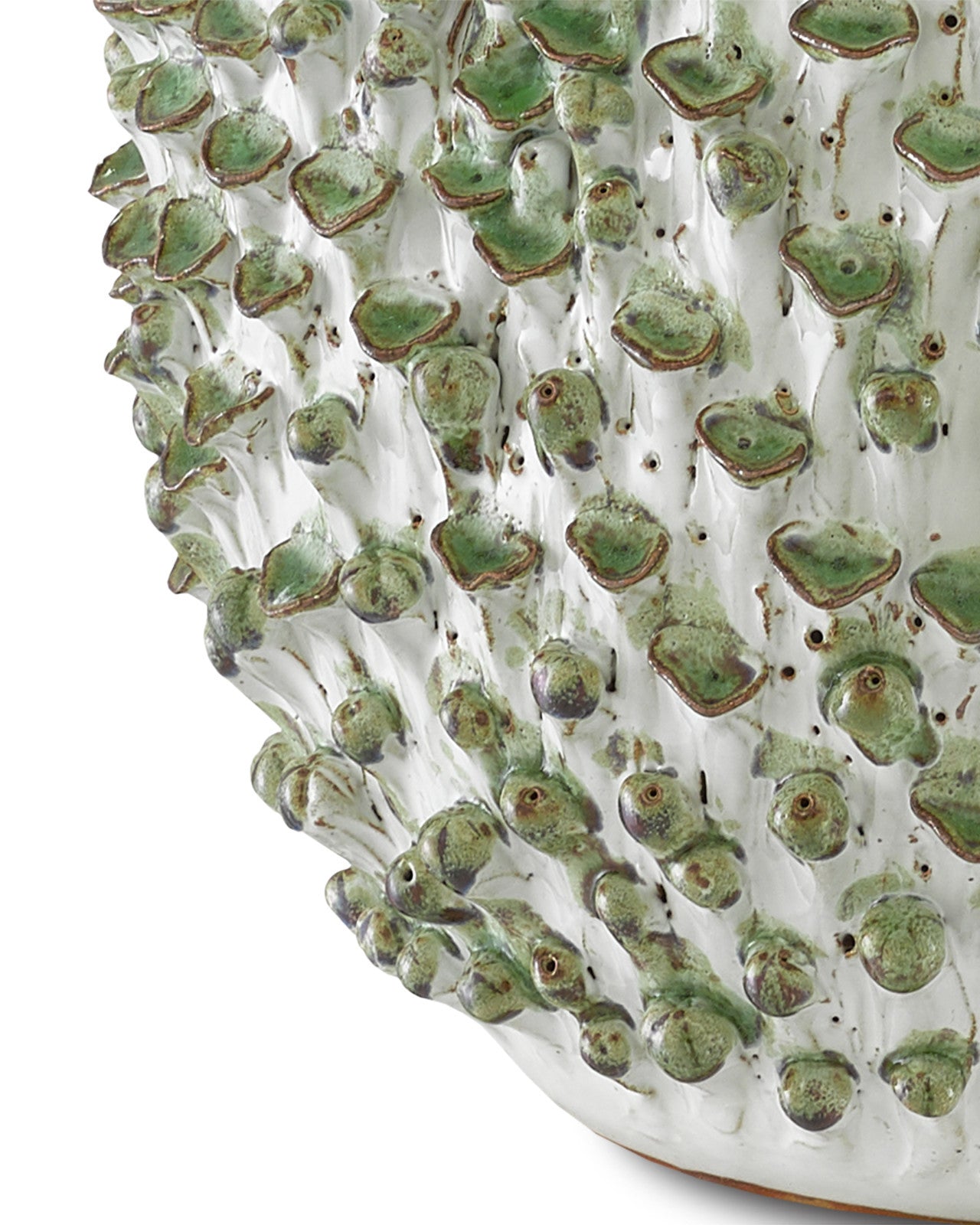The Small Green Vase is made by a group of women who live at the border of Burma and Thailand. The black terracotta vase has a white glazing and tiny green leaves, each applied by hand to the side of the vase. This white vase is truly an artisanal piece, as each leaf is hand-glazed with a very subtle green glazing.